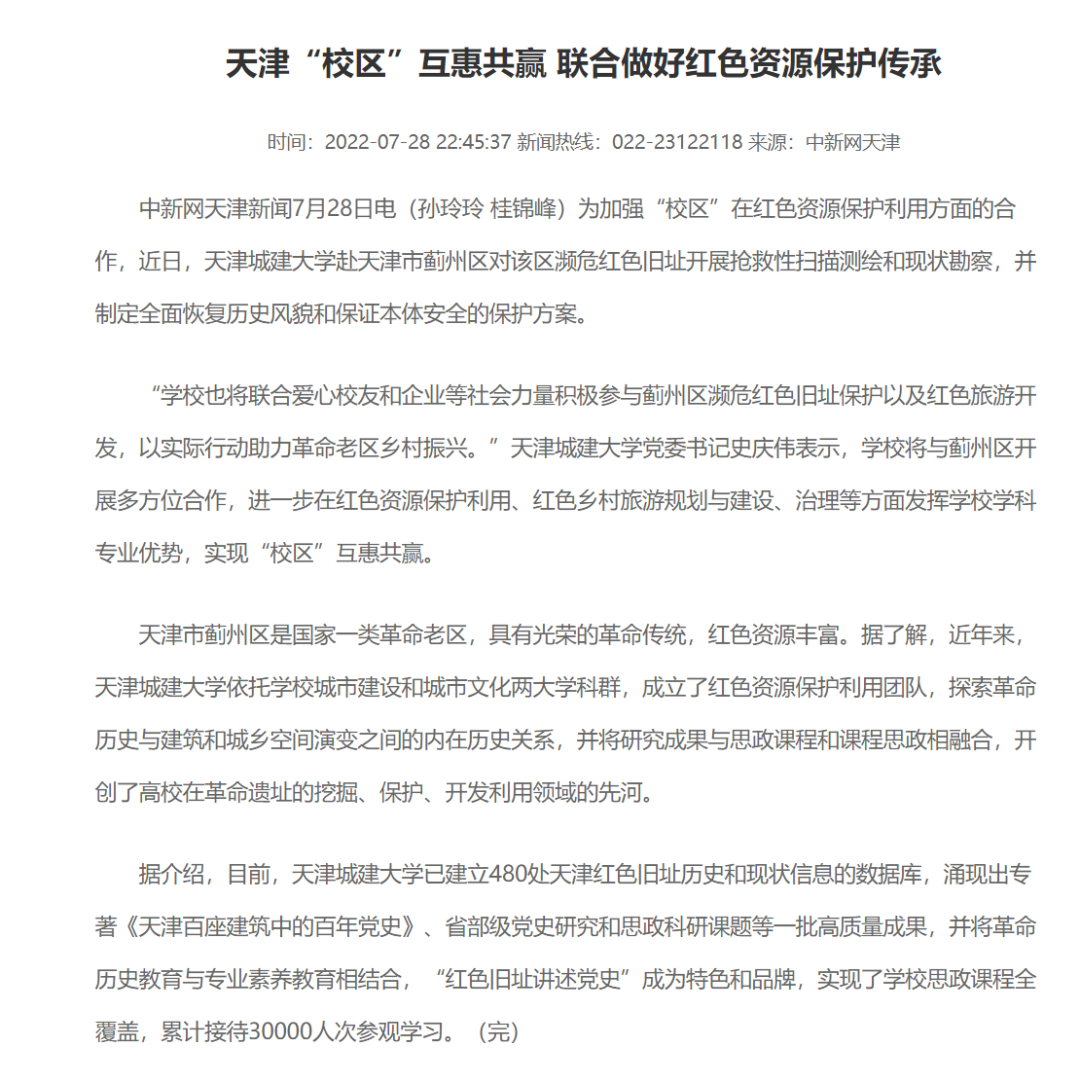 中国新闻网以“天津‘校区’互惠共赢 联合做好红色资源保护传承”为题对beat365工作进行报道