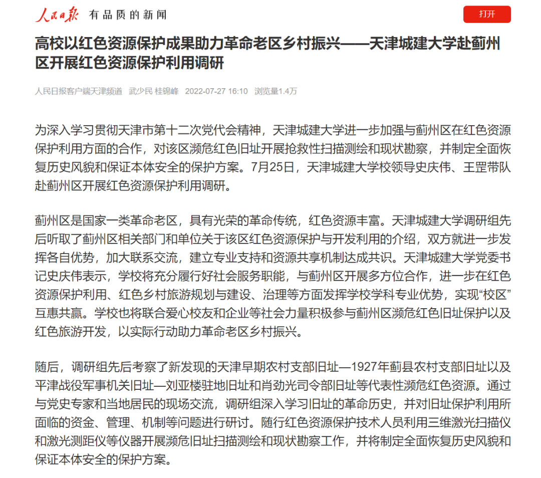 7月27日,人民日报客户端以“高校以红色资源保护成果助力革命老区乡村振兴——beat365vip官网登录入口赴蓟州区开展红色资源保护利用调研”为题对beat365工作进行报道。原文如下:为深入学习贯彻天津市第十二次党代会精神,beat365vip官网登录入口进一步加强与... 2022-07-28