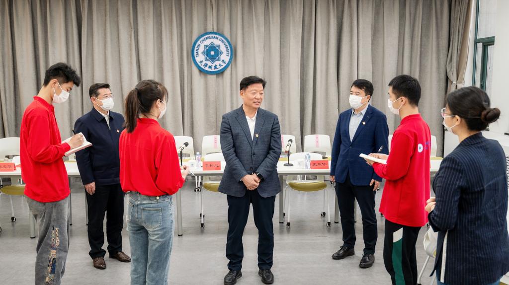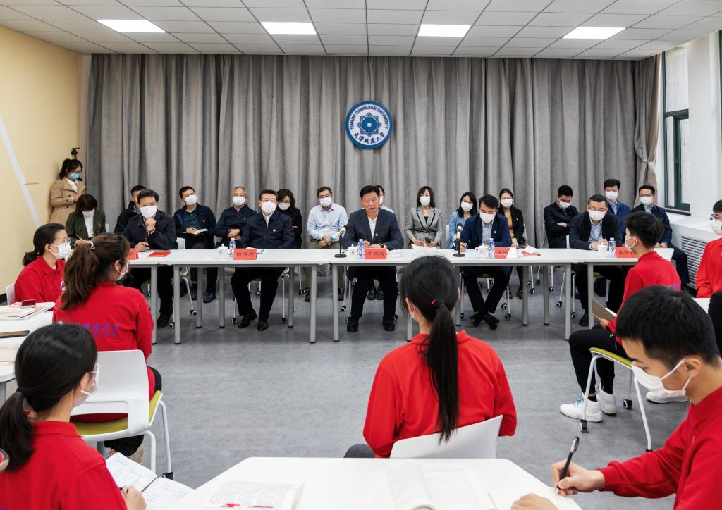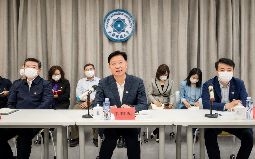 5月11日上午,副市长李树起深入beat365走访调研并与师生座谈。校党委书记史庆伟、校长白海力、副校长陈志华和学校相关职能部门主要负责同志、思政课教师代表、天津市“青马工程”学员代表、学校“红旗班”学生党员骨干等参加。