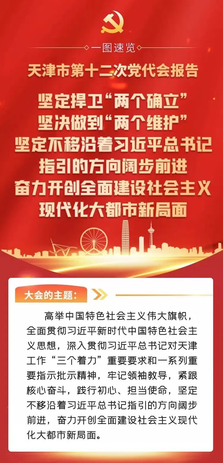 6月16日上午,中国共产党天津市第十二次代表大会在天津礼堂隆重召开。此次大会是在我们踏上全面建设社会主义现代化国家新征程、满怀豪情迎接党的二十大胜利召开的重要历史时刻,在天津全面建设社会主义现代化大都市的关键时期,召开的一次十分重要的会议。李鸿忠同志代表中共天津市第十一届委员会向大会作题为《坚定捍卫“两个确立” 坚决做到“两个维护” 坚定不移沿着习近平总书记指引的方向阔步前进 奋力开创全面建设社会主义现代化大都市新局面》的报告。
