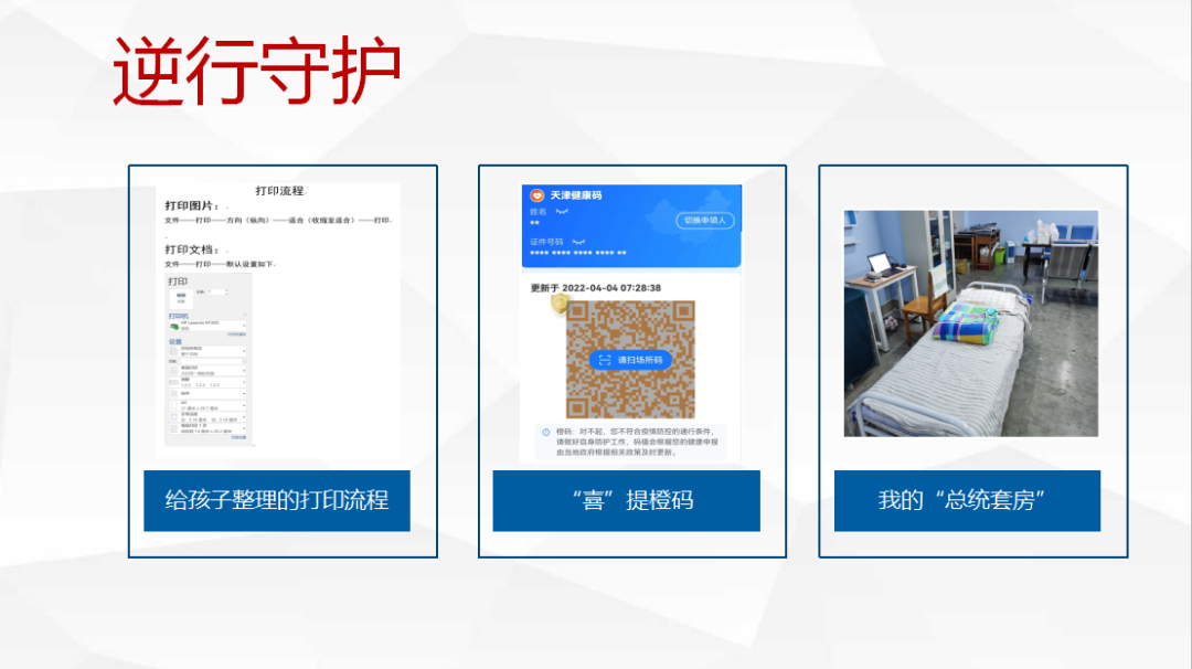 4月2日,一场“新冠疫情”突袭beat365,接到通知,我没有迟疑,决定以最快的速度进校支援。孩子听到这个消息,首先慌了神,“妈妈,我网课怎么办?作业怎么交?”我先是火速把父母接到我家,又赶紧给孩子安排了一场集训:如何使用打印机,如何登录腾讯会议,在哪里找到收藏的线上课程网址……又跟队友进行了工作交接:每天作业怎么提交,哪天有课外班,要做什么准备……因为爱人经常出差,孩子常说我是家里的顶梁柱,然而此刻我必须暂时放下小家,因为学校里还有1万3千多个学生和他们身后1万3千多个牵肠挂肚的家庭。进校通道在身后关闭,健康码由绿变橙,没有迟疑,只有义无反顾。进校后,我和另一位老师临时借宿在学院的创就业办公室,这里有桌有椅有阳光,我们戏称它为“总统套房”。