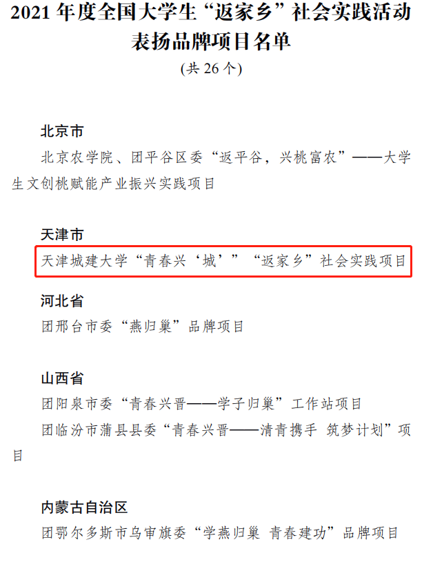 近日,共青团中央发布2021年度全国大学生“返家乡”社会实践活动总结通报结果,beat365“青春兴‘城’”“返家乡”实践项目”荣获2021年度全国大学生“返家乡”社会实践活动表扬品牌项目,此次获评项目为天津市唯一入选项目。