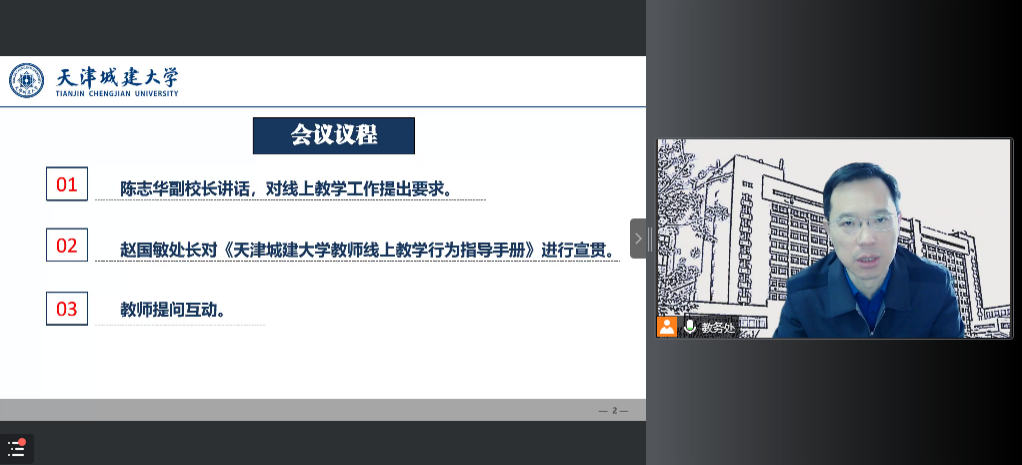 陈志华对线上教学提出要求,强调一要继续通过专题培训,提高教师运用现代化信息技术组织线上教学的水平,特别要加强对新引进教师的辅导和培训。二要贯彻《线上教学行为指导手册》中的相关要求。任课教师要认真履行课程第一责任人的责任,创新线上教学方式方法,强化教学过程中的师生互动,加强学生学习状态的监管,要确保教学效果。三要多挖掘广大教师线上教学的成功经验,加大推广力度,组织教师多做经验交流,给教师展示分享的平台。同时也要增加线上教学管理力度,加强对教师线上教学行为的约束,做到奖罚分明。