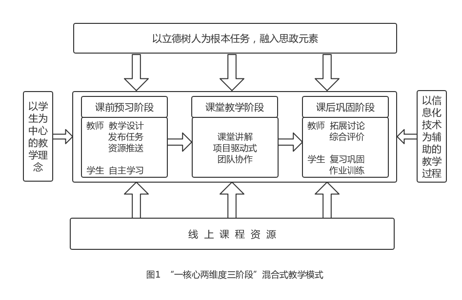 本课程线上教学基于“一核心两维度三阶段”混合式教学模式开展,如图所示。课程组以立德树人为根本任务,围绕课程主要内容积极挖掘了相关思政元素。两个维度贯穿始终,即以学生为中心的教育理念和信息化技术融入教育教学。三阶段即课前预习阶段、课堂教学阶段和课后巩固阶段,三个阶段完整地支撑了教学全过程。线上课程资源的建设是混合式教学的基础,课程组采用选用和自建相结合的方式,建立了大量优质且符合beat365定位和学生特点的教学资源。
