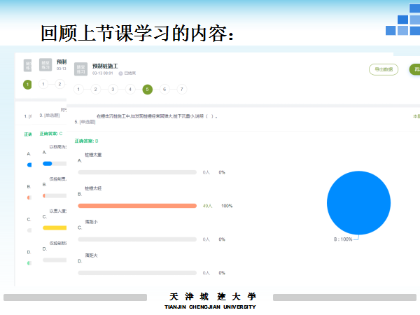 《土木工程施工技术与组织A》是土木工程专业核心专业课之一,该课程实践性、专业性非常强,如何在疫情防控期间开展教学,保证课程教学质量,是我们在网络教学中遇到的最大挑战。受疫情影响,课程组充分利用学习通线上资源,教师课上重点讲授各个知识点,同学们通过线上知识点、习题库以及案例库进行课前预习及课后复习。教学实践过程表明,这一教学方法取得了较好效果,现汇报交流如下: