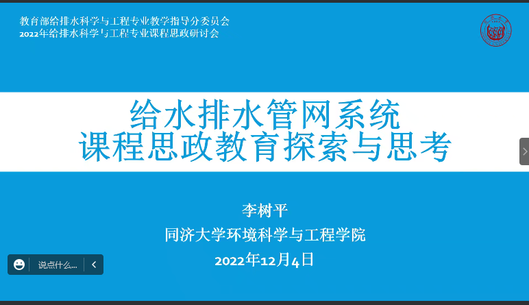 同济大学李树平副教授围绕“给水排水管网系统课程思政教育探索与思考”主题,结合“绿水青山就是金山银山”“碳达峰碳中和”两个专题分享了课程思政的思考。