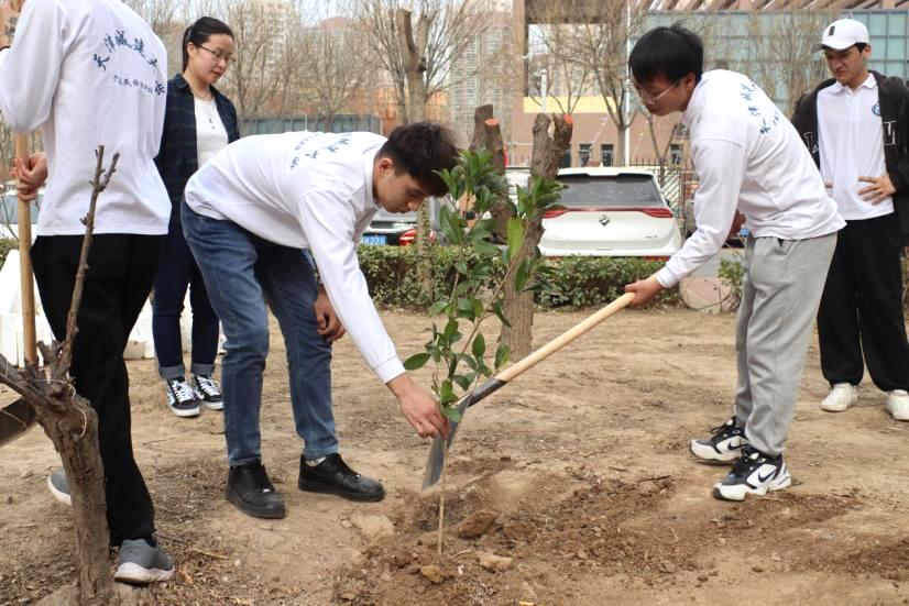 在植树活动现场,“红旗班”学员和预科班少数民族同学干劲十足,大家分工协作,挥锹铲土,填坑压实,各个环节衔接有序。经过紧张有序的劳动,一棵棵树苗纵横整齐、迎风挺立、绽放生机,为春天增添了浓浓绿意,成为了一道靓丽的风景线。