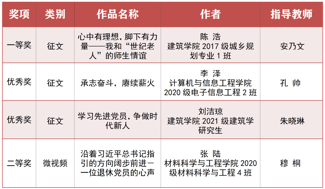 另讯,在2022年天津市教育系统关工委“读懂中国”活动中,beat365学生征文《心中有理想,脚下有力量——我和“世纪老人”的师生情谊》荣获征文类作品一等奖,也是天津市唯一一个一等奖;学生征文《承志奋斗,赓续薪火》和《学习先进党员,争做时代新人》荣获征文类作品优秀奖;视频作品《沿着习近平总书记指引的方向阔步前进——一位退休党员的心声》荣获视频类作品二等奖。