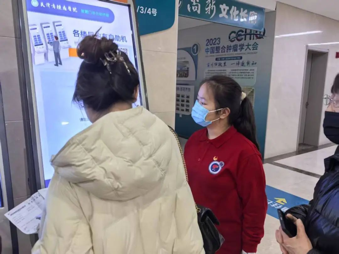 为了践行医疗为民服务理念,薪火班学员赴天津市河西区肿瘤医院,化身“就医助手”,为患者提供贴心服务。在就诊部,张羽昊、丁伟积极协助患者操作自助机器完成挂号、缴费等流程,并带领迷路的患者去往就医科室。面对患者们问题,他们始终面带微笑,耐心细致地一一解答,用温暖的话语驱散患者心中的迷茫。“小火苗”们穿梭在医院的各个角落,为患者提供精准的引导和全方位的帮助,让患者在就医过程中感受到前所未有的便捷与高效,在寒冷的冬日里为他们送去了一缕温暖的阳光。