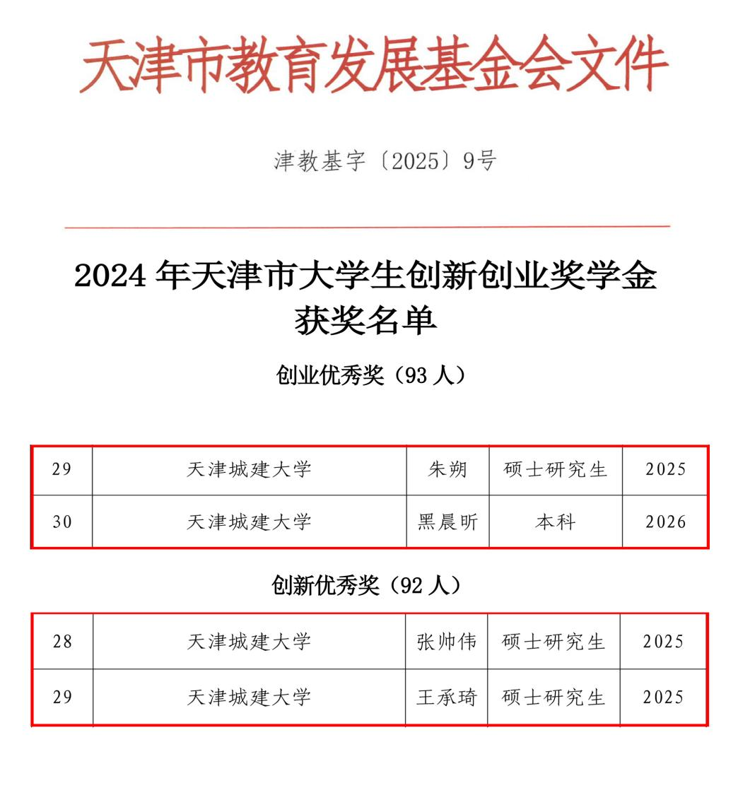 日前,天津市教育委员会、天津市教育发展基金会联合组织开展了2024年天津市大学生创新创业奖学金评选工作,beat3654名学生荣获天津市大学生创新创业奖学金。