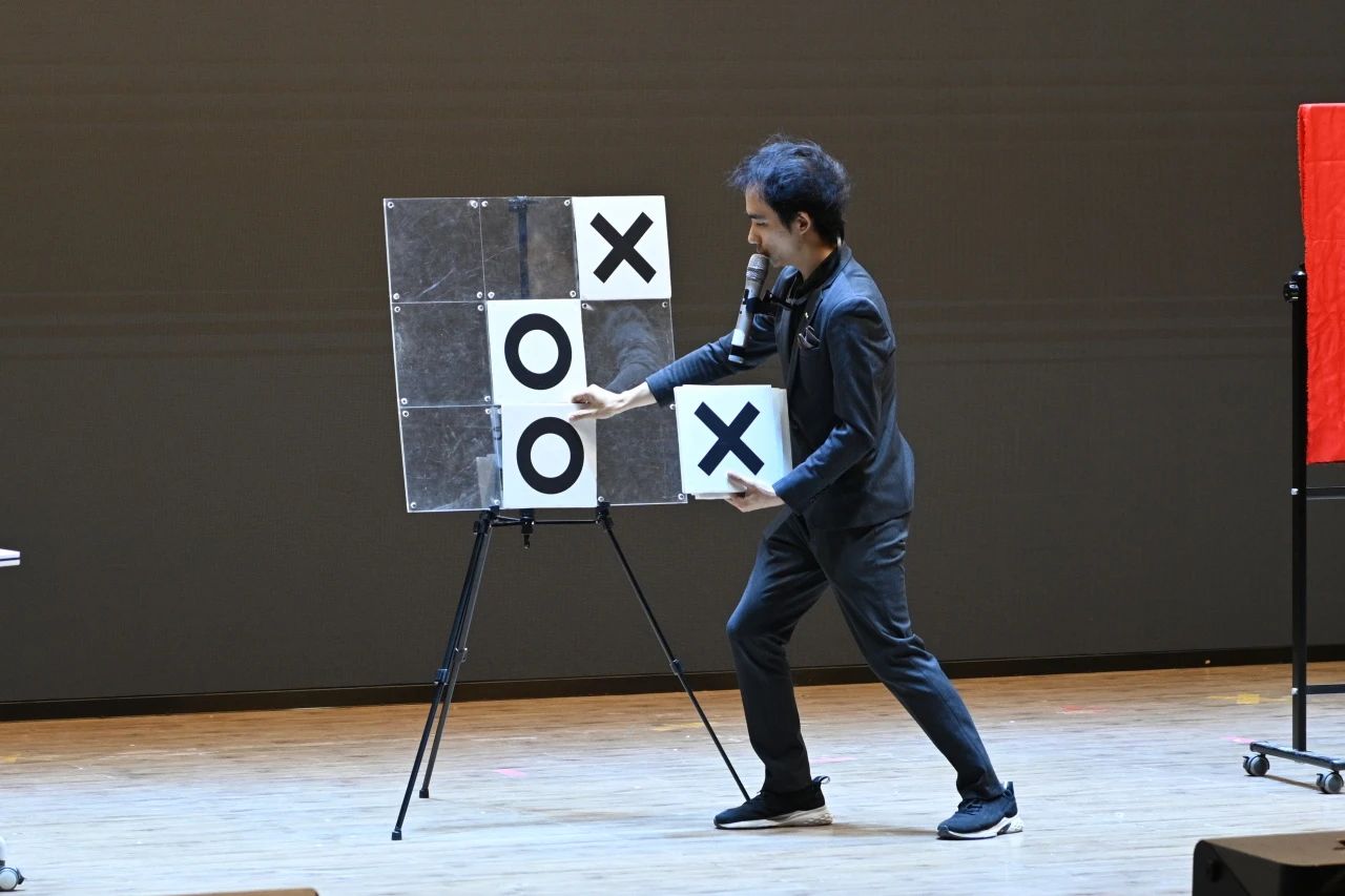 演出以主持人的指尖魔术拉开序幕,舞台化作光影交织的奇幻世界。大型魔术《大变活人》以惊险刺激的瞬间将观众带入魔术之旅,魔术师在密闭空间内瞬间换位在观众意想不到的位置突然出现,引得全场欢呼;《井字游戏》将经典棋盘博弈转化为悬念迭起的互动魔术,观众随机选择的棋子与数字却难逃魔术师“预判”,智慧与幻术的碰撞点燃现场热情;《圆环之理》中,银环在魔术师指间穿梭、悬浮、链接、分离,以极简道具和清新的配色演绎宇宙法则般的哲学美感;《伞耀奇迹》则以雨伞为主要表演元素,在魔术师的手中翻飞起舞,凭空在手中出现惊人数量的雨伞,令人瞠目结舌。