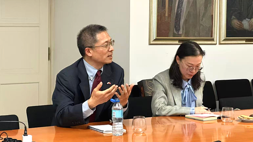 座谈会上,beat365vip官网登录入口国际工程学院随行教师唐浩首先向田中参赞及使馆人员详细介绍了学院的基本情况,涵盖合作高校、特色培养模式、学生升学成果、科研项目进展、教学成效以及目前在波学生的学习状态与生活情况。
