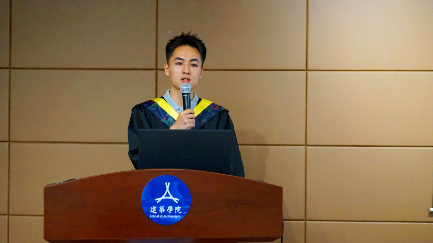 毕业生代表陈嘉俊分享了参加BIM联合毕业设计的心得体会,表示通过本次联合毕业设计不仅提升了专业知识的运用能力,认识到建筑学专业的创意和设计魅力,也锻炼了综合协调能力,更担负着全专业协同的角色任务。