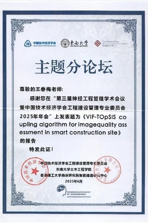 经济与管理学院教师王春梅老师做了题为《VIF–TOPSIS coupling algorithm for image quality assessment in smart construction site management》的分论坛报告。该报告阐述了VIF–TOPSIS耦合算法在图像/视频修复领域的技术优势,并重点论证了其在智慧工地智能监控系统的实践路径与提升价值。