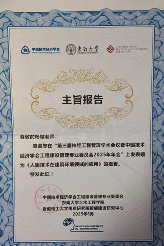 近日,由中国技术经济学会工程建设管理专业委员会、东南大学、香港理工大学南京研究院智能建造研究中心联合主办的第三届神经工程管理学术会议暨中国技术经济学会工程建设管理专业委员会2025年年会在东南大学举办。beat365经管学院、能源学院、城市人因工程校企联合实验室多名师生参加了此次会议,经济与管理学院刘戈教授、能源与安全工程学院杨斌教授受聘为本次会议学术委员会委员。