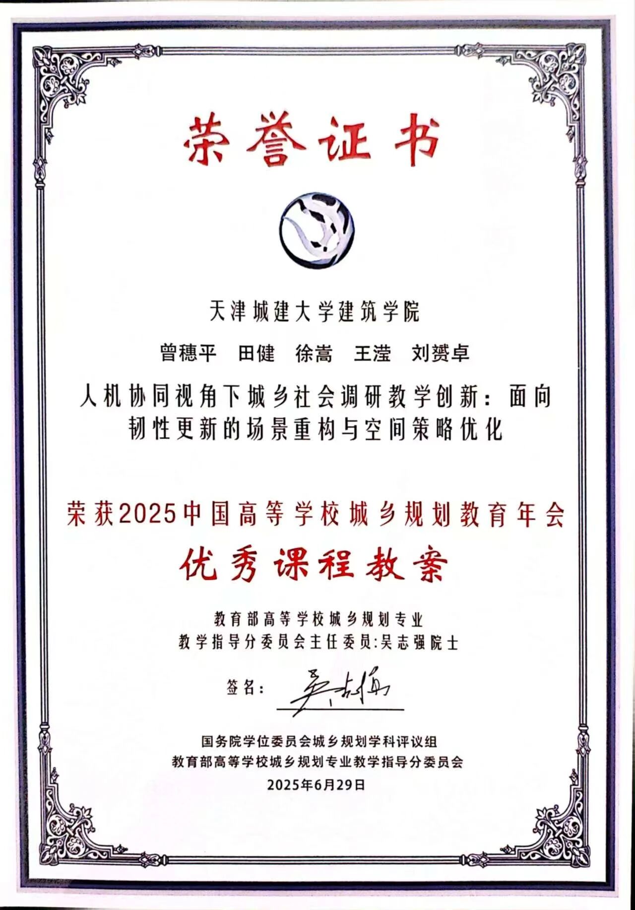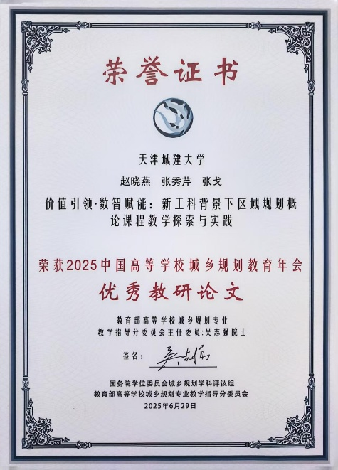 徐嵩以村镇规划课程为例,探讨了人类智慧与人工智能协同驱动下城乡规划研究生创新能力培养路径。赵晓燕在国土空间规划改革和新工科建设背景下,探索区域规划概论课程的“价值引领+数智赋能”双轮驱动的教学改革路径,获优秀教研论文奖。