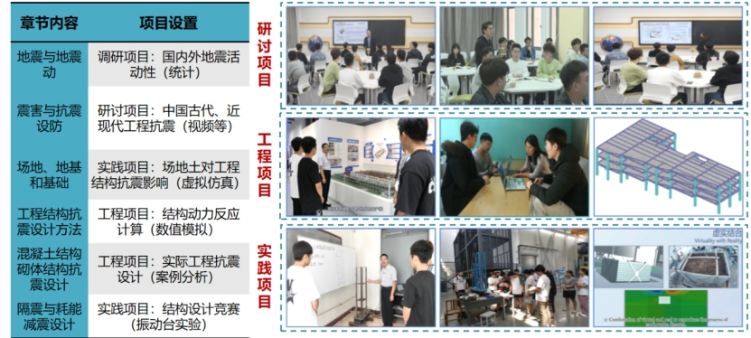 课程突破传统教学模式,以"项目驱动、能力导向"为核心,将地震工程理论、现代抗震技术与工程实践有机融合。课程设计了贯穿全周期的综合项目任务,如历史地震案例分析、减震结构优化设计、振动台实验验证等,让学生从"学知识"转向"用知识"。通过小组协作完成真实工程场景中的抗震设计挑战,有助于学生深入理解规范条文背后的力学原理,培养了学生"分析-设计-优化"的系统工程思维。