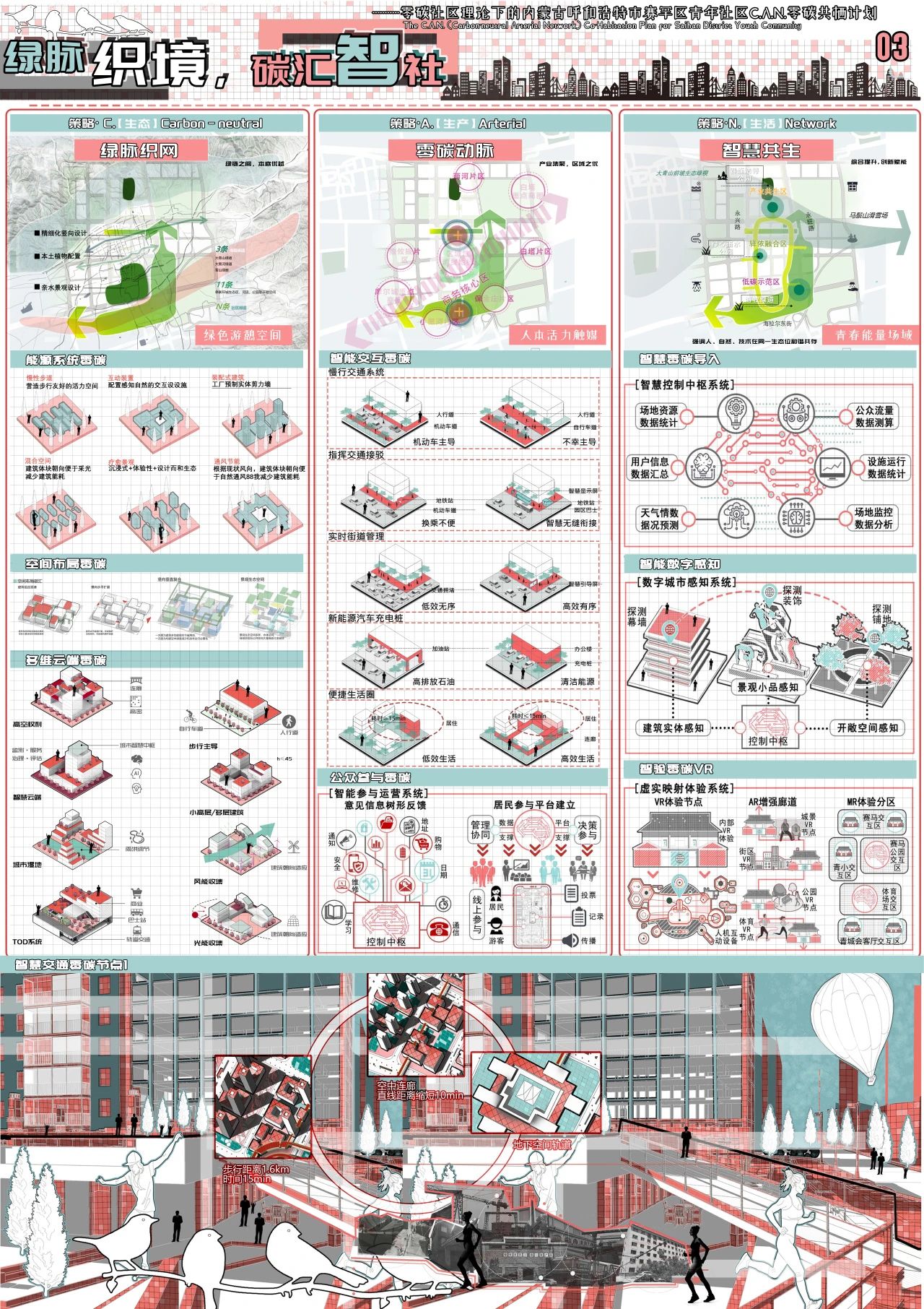 本次规划设计的目的是促进青年发展、增强社区凝聚力、促进就业与创业和提升生活质量,为年轻人创造充满活力和机遇的环境,积极促进青年群体的全面发展和社会参与。规划针对社区现存人车混流、交通单一、建筑老旧、墙体破败、生活不便、功能匮乏、绿地流失、生态受损等问题,秉持低碳智能、绿色可持续的理念,提出C.A.N. 分级子系统“Carbon-natural ”多元链接智慧出行、“Arterial ”内聚融合生态建筑、“Network”永续发展便民生活,从“绿脉织网、动脉供能、智慧调度”三个层面提出了以零碳为核心的社区更新策略。切实为年轻人量身打造一个充满活力的生活圈和品质社交圈。