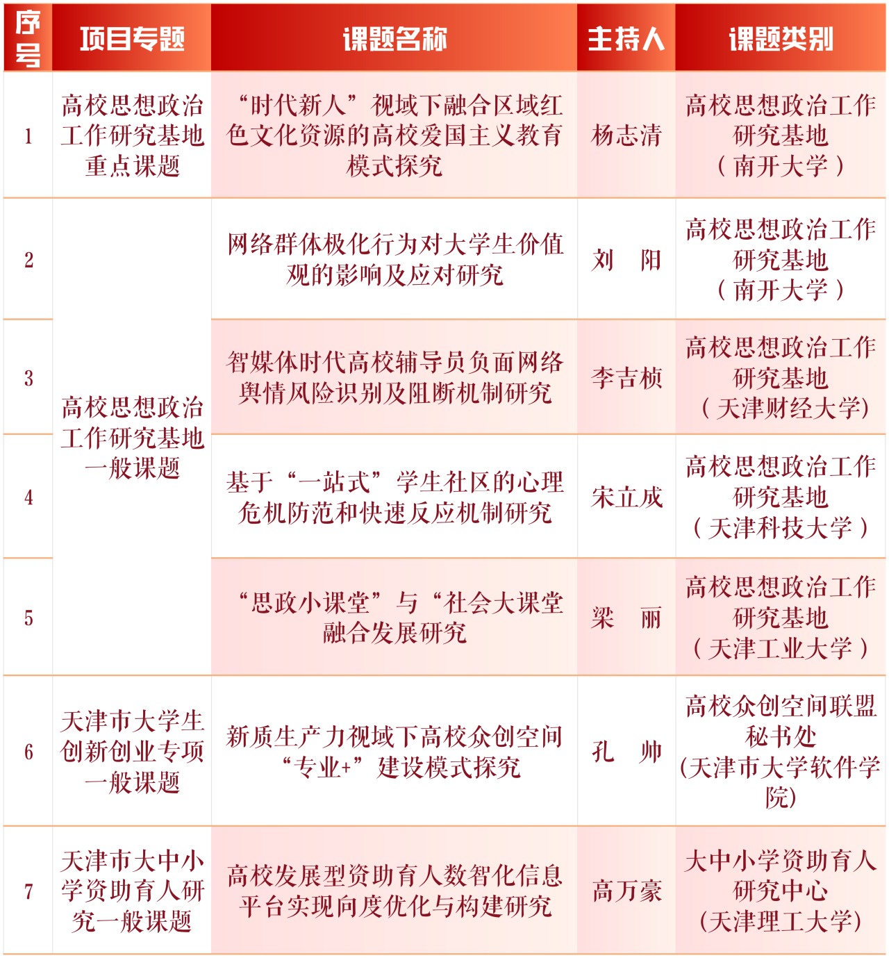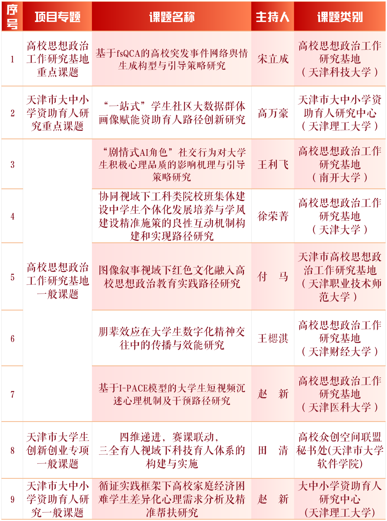 近日,市教育两委公布了2024年天津市大中小思想政治工作专项课题结项和2025年大中小思想政治工作专项课题立项名单。经专家组评审,beat3657项课题顺利结项;在2025年度大中小思想政治工作专项课题中,9项课题成功获批立项,其中重点课题2项,一般课题7项。