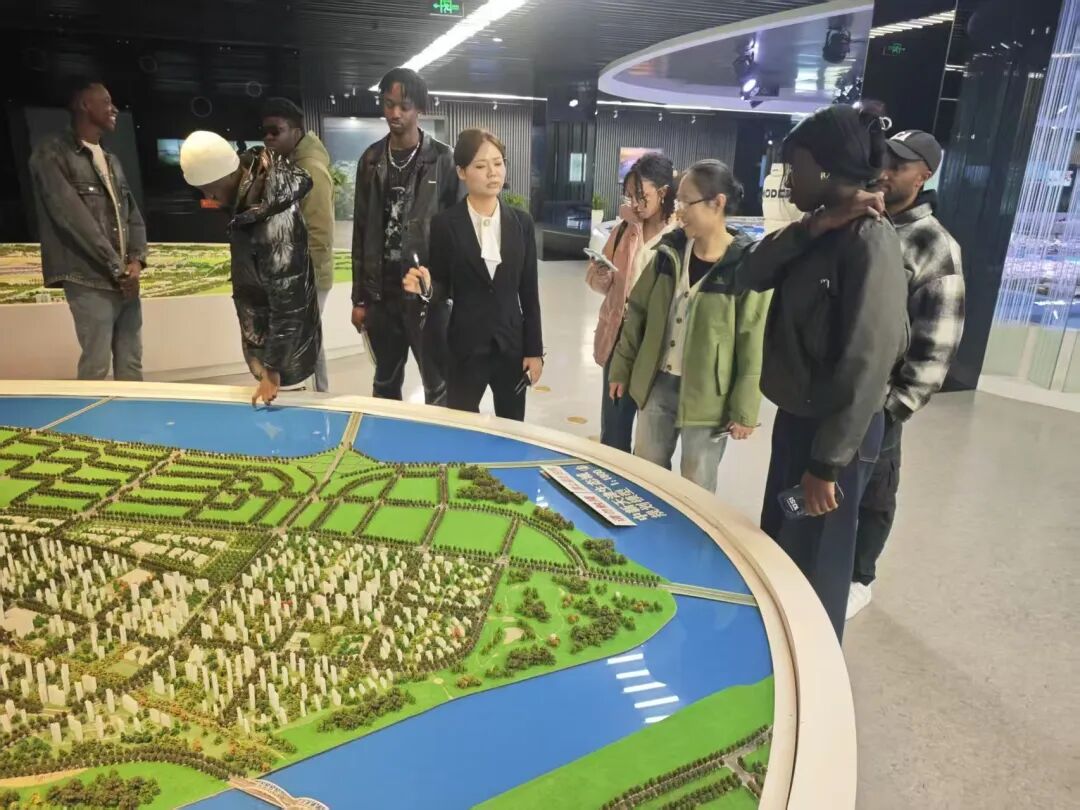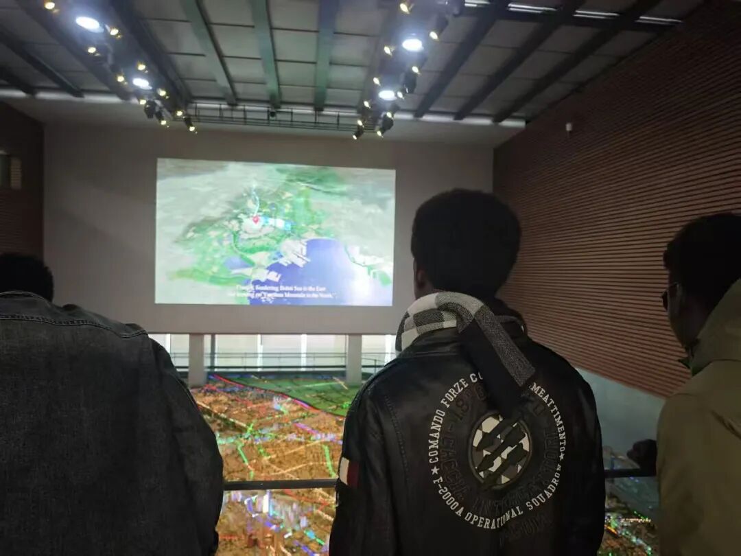 整个参观的高潮无疑是位于展馆核心区域的“天津市中心城区总体规划模型”。当留学生们走上观景平台,俯瞰按1:1000比例制作的、面积达数百平方米的巨型沙盘模型时,无不发出惊叹。随着灯光秀与宣传片的同步演示,天津“双城双港、相向拓展”的宏大空间战略布局变得一目了然。来自摩洛哥的艾雅兴奋地说:“这个模型太壮观了!它让我清晰地看到了我所在学校的位置、我常去的商业区,以及整个城市的交通网络,让我对天津的城市结构有了更全面、更立体地认识。”