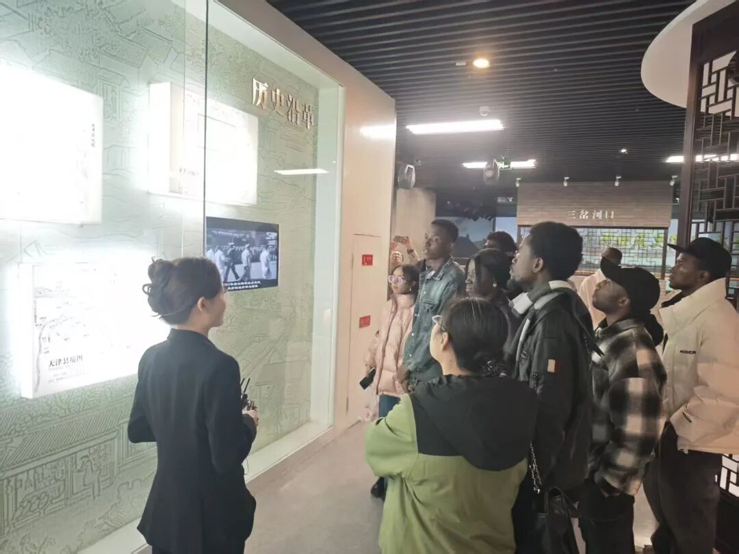 步入以“城市时光走廊”为主题的展区,一幅描绘天津因河而生、依港而兴的历史画卷徐徐展开。留学生们被精美的历史地图、老照片和实物模型所吸引,从六百多年的建卫史,到“近代百年看天津”的租界建筑风貌,再到新中国成立后的工业辉煌,大家认真聆听,不时驻足提问。来自尼日利亚的欧弟表示:“之前在五大道散步时就很喜欢那些老建筑,今天在这里系统地了解了它们背后的历史故事,感觉非常震撼,天津的历史和文化比我想象的还要丰富。”