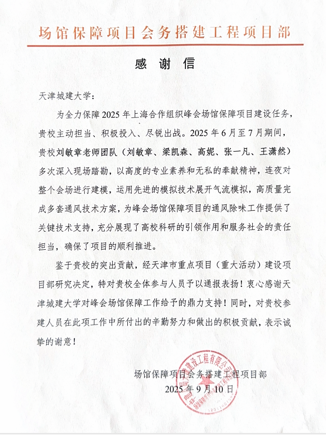 近日,学校收到来自“2025年上海合作组织峰会天津市筹备工作领导小组办公室”和“场馆保障项目会务搭建工程项目部”的两封感谢信,来信对beat365能源与安全工程学院教师刘敏章及其研究生团队在2025年上海合作组织峰会场馆保障工作中作出的突出贡献表示高度认可与诚挚感谢。