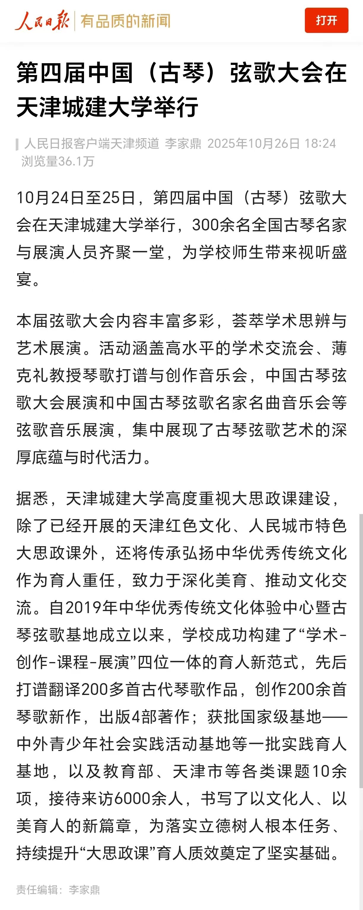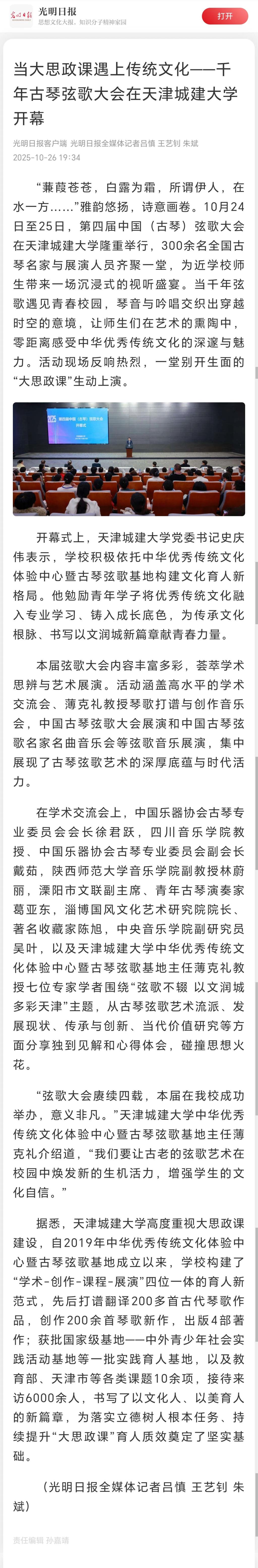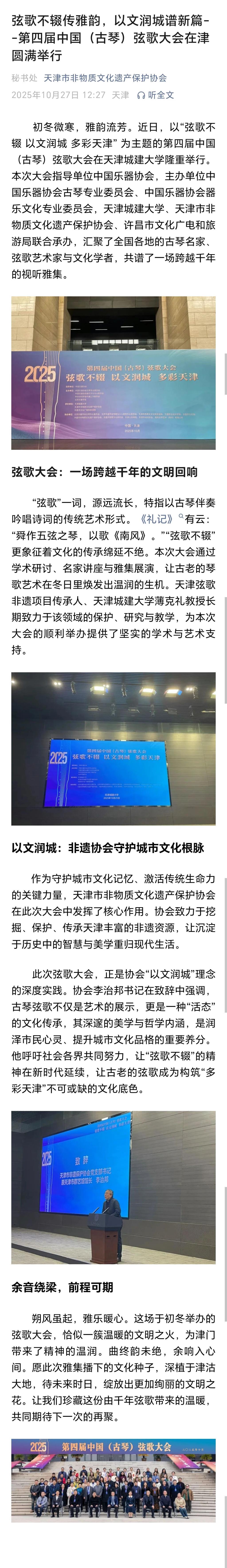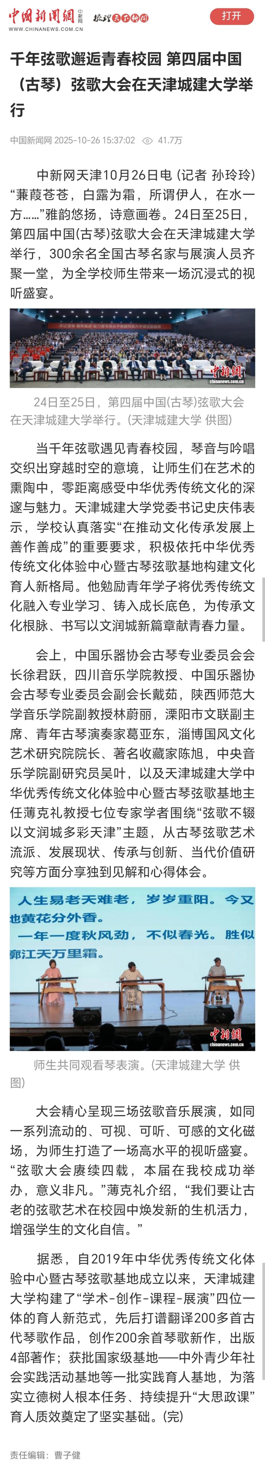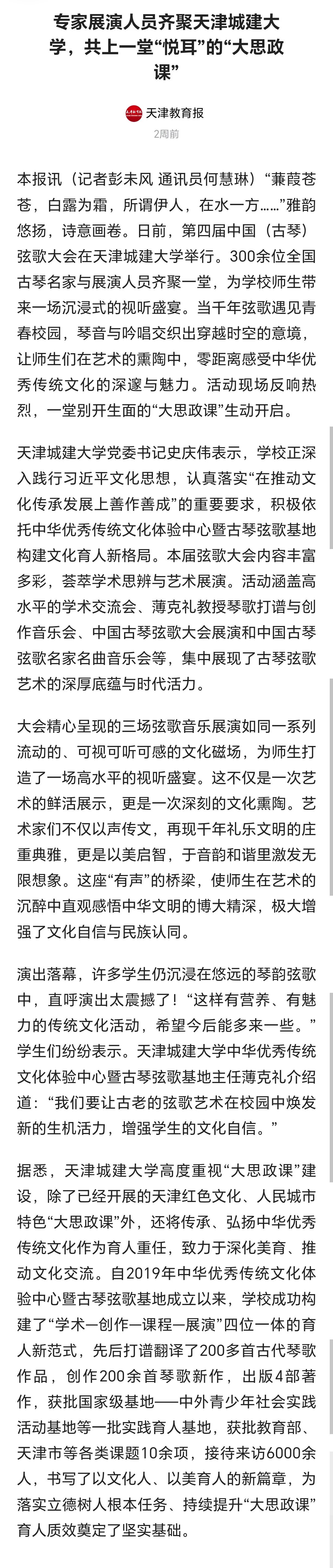 10月24日-25日,第四届中国(古琴)弦歌大会在beat365隆重召开。全国古琴名家与展演人员齐聚一堂,为学校师生带来一场沉浸式的视听盛宴。琴音与吟唱交织出穿越时空的意境,让师生们在艺术的熏陶中,零距离感受中华优秀传统文化的深邃与魅力。活动现场反响热烈,受到了人民日报、光明日报、中国日报、中国教育报、天津教育报、中国新闻网、津门网络大思政等多家媒体宣传报道。