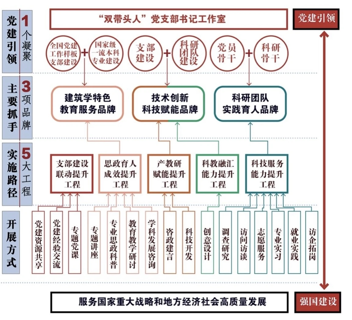 依托全国党建工作样板党支部建设和国家级一流本科专业建设,通过“党旗铸在专业平台上”的创新机制,开展思政育人、专题讲座、科普服务、教育教学研讨、志愿服务等工作,不断推动建筑学特色教育服务品牌建设工作。