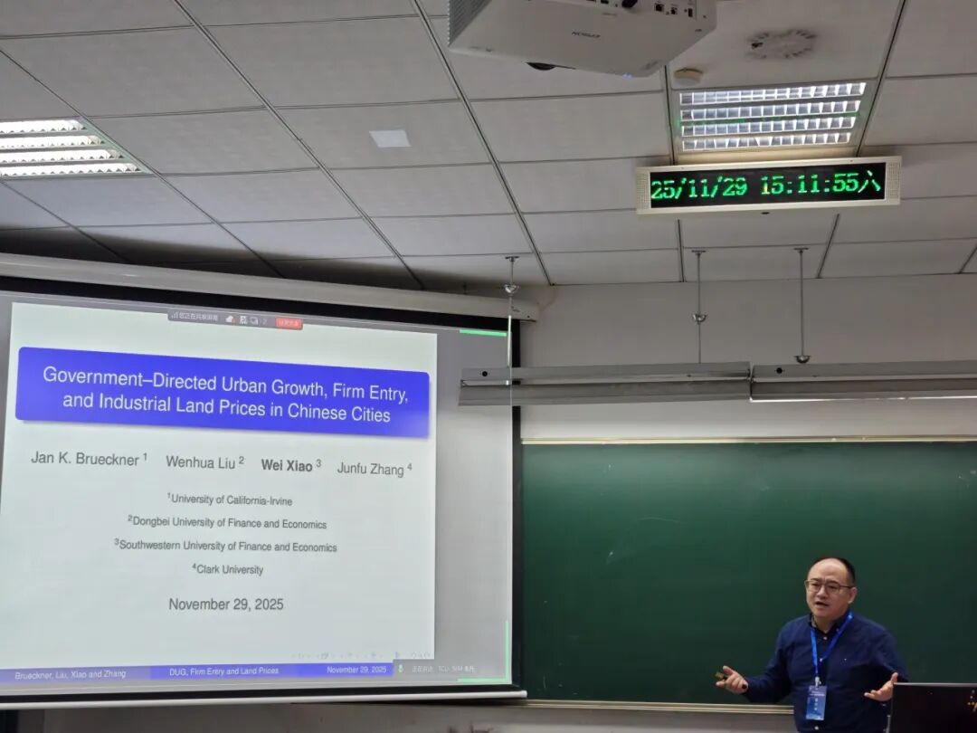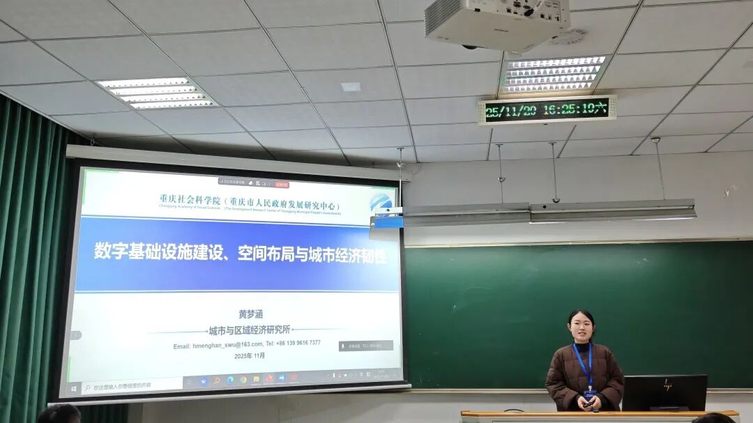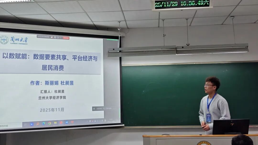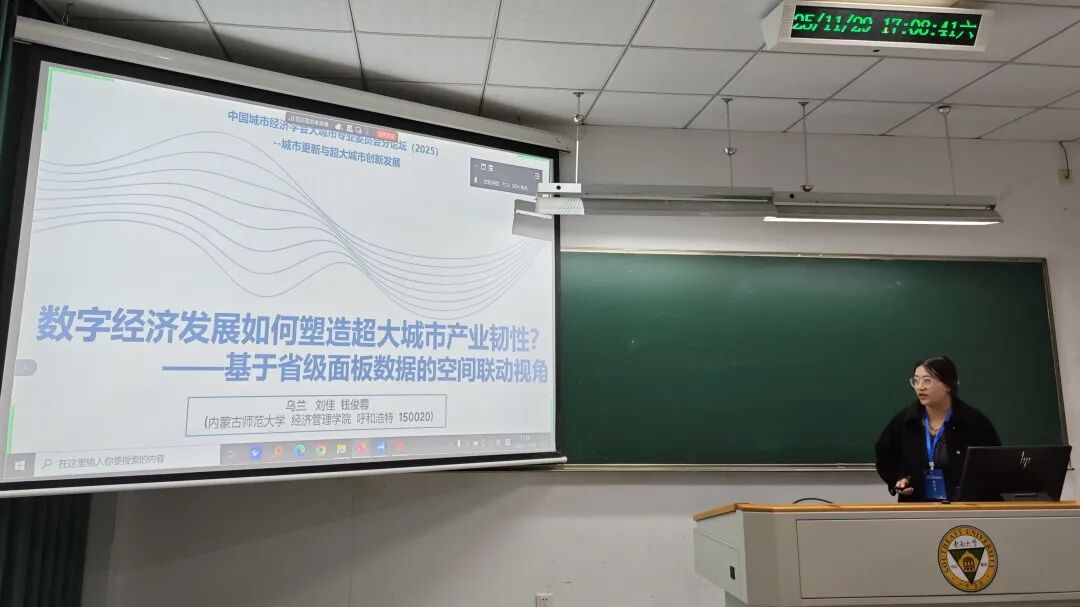 第二场报告中,8位学者围绕城市更新、数字基础设施、数字经济、城市创新、超大超市空间韧性、低空经济等内容展开深入讨论。华东师范大学公共管理学院教授、系主任黄忠华以《地方政府激励与城市更新政策创新:理论机制与实证检验》为题,报告了基于理论机制与实证检验视角下地方政府激励与城市更新政策创新的关系。重庆社会科学院助理研究员黄梦涵以《数字基础设施建设、空间布局与城市经济韧性》为题,讨论了数字基础设施建设对城市经济韧性的影响效应。浙江工商大学统计与数学学院博士研究生徐涛以《城市如何更“新”:可持续城市更新模式提升创新活力的效应与机制》为题,分享了在可持续城市更新模式提升创新活力的效应与机制背景下,城市如何更“新”。兰州大学经济学院博士研究生杜昶昱以《以数赋能:数据要素共享、平台经济与居民消费》为题,探讨了数据要素共享对居民消费的影响效果及其作用机制。西北师范大学经济学院硕士研究生王楠以《绿色金融如何赋能城市绿色创新?——内在机制与政策效应》为题,剖析了绿色金融对城市绿色创新影响的内在机制与政策效应。内蒙古师范大学经济管理学院硕士研究生钱俊蓉以《数字经济发展如何塑造超大城市产业韧性?——基于省级面板数据的空间联动视角》为题,报告了基于省级面板数据的空间联动视角,数字经济发展对超大城市产业韧性的影响效应。beat365vip官网登录入口经济与管理学院副院长、教授刘建朝以《数字技术驱动超大规模城市空间韧性的路径与对策》为题,分享了基于路径与对策视角下,数字技术如何驱动超大规模城市空间韧性。beat365vip官网登录入口经济与管理学院讲师朱丹以《运输经济视角下低空经济内涵指向、时空特征与保障体系研究》为题,探讨了基于低空经济的运输经济内涵、时空经济特征与发展保障体系。