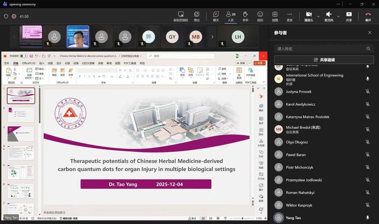 波兰克拉科夫工业大学Piotr Michorczyk院长线上连线致辞,他高度评价了两校联合研究中心取得的合作成效,希望以此次研讨会为新起点,进一步深化双方在纳米材料制备与应用技术转化等领域的务实合作,携手应对全球材料科学领域的机遇与挑战。
