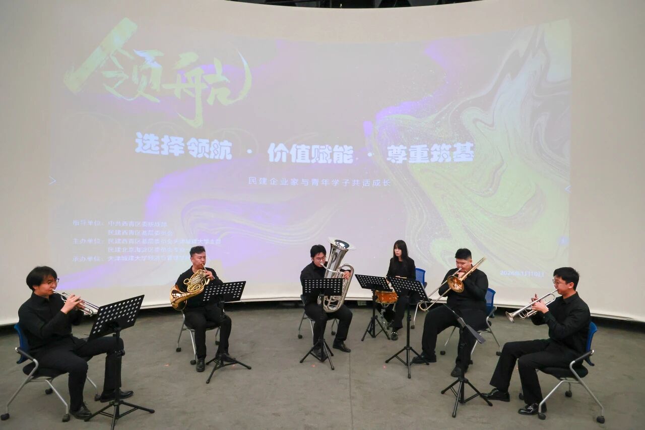 此次活动汇聚了京津冀地区政、企、学各界代表,为师生带来了一场融合思想启迪与实践指导的成长交流盛宴。活动开幕式由民建西青区基层委员会beat365vip官网登录入口支部主委、经济与管理学院院长王振坡教授主持。开幕式在激昂奋进的铜管五重奏《无人智胜进行曲》中拉开序幕,民建西青会员的精彩演绎为现场注入了蓬勃活力。
