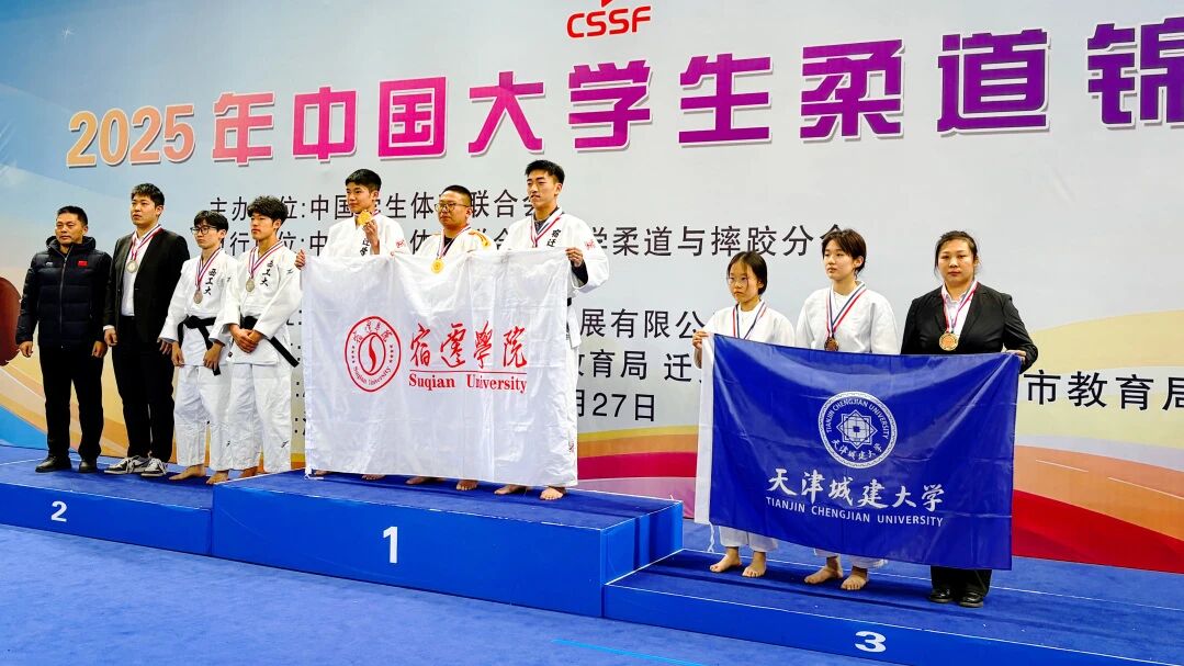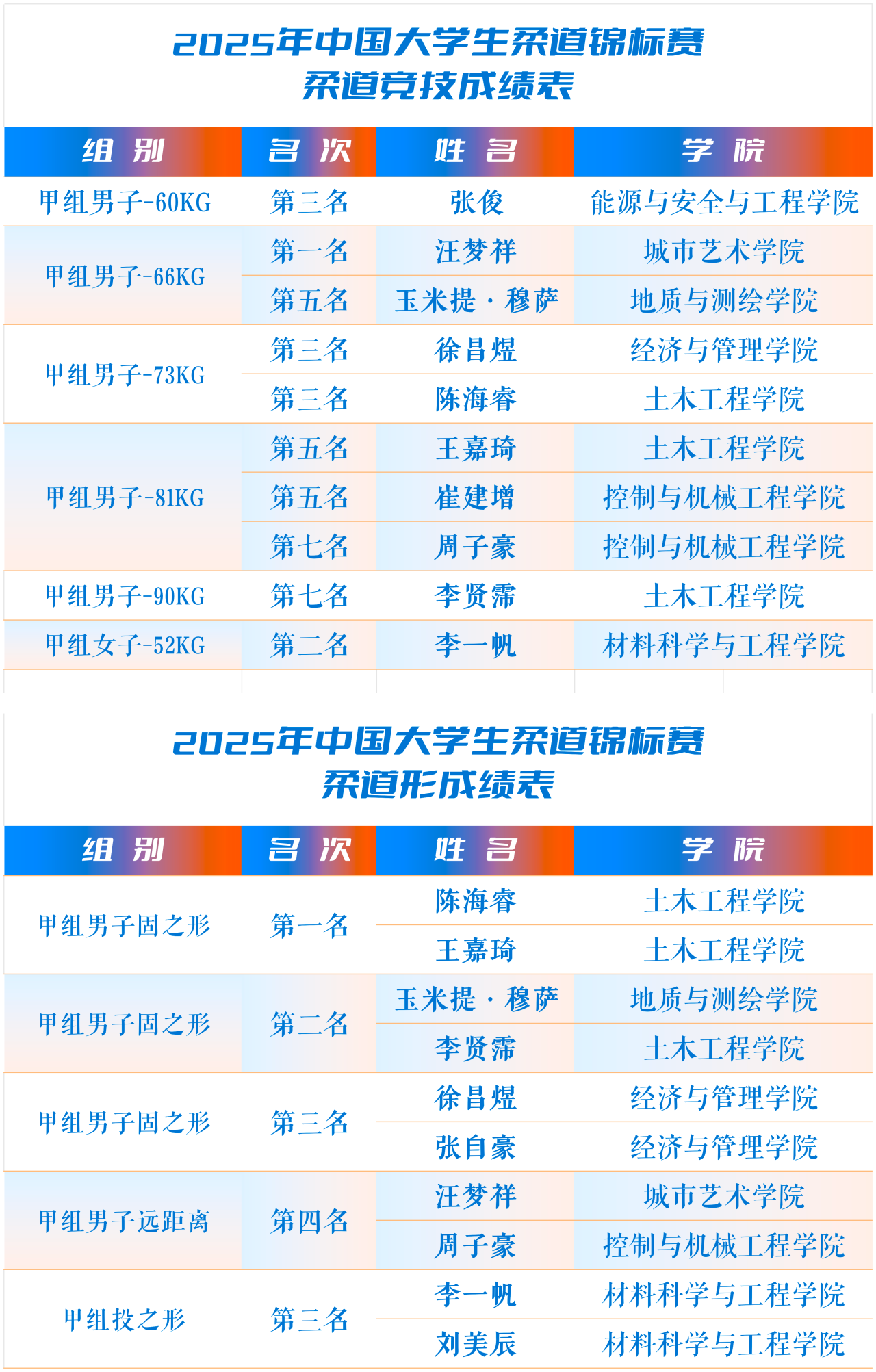近日,2025年中国大学生柔道锦标赛在河北省迁安市圆满落幕。beat365由体育部主任王建华带队、田旭老师担任教练的柔道队奋勇拼搏,最终收获2金、2银、5铜以及1个第四名、3个第五名、2个第七名的优异成绩,并一举夺得团体总分男子竞技第一名、柔道形第二名,女子竞技第八名、柔道形第七名,实现beat365在柔道竞技项目上金牌“零的突破”。