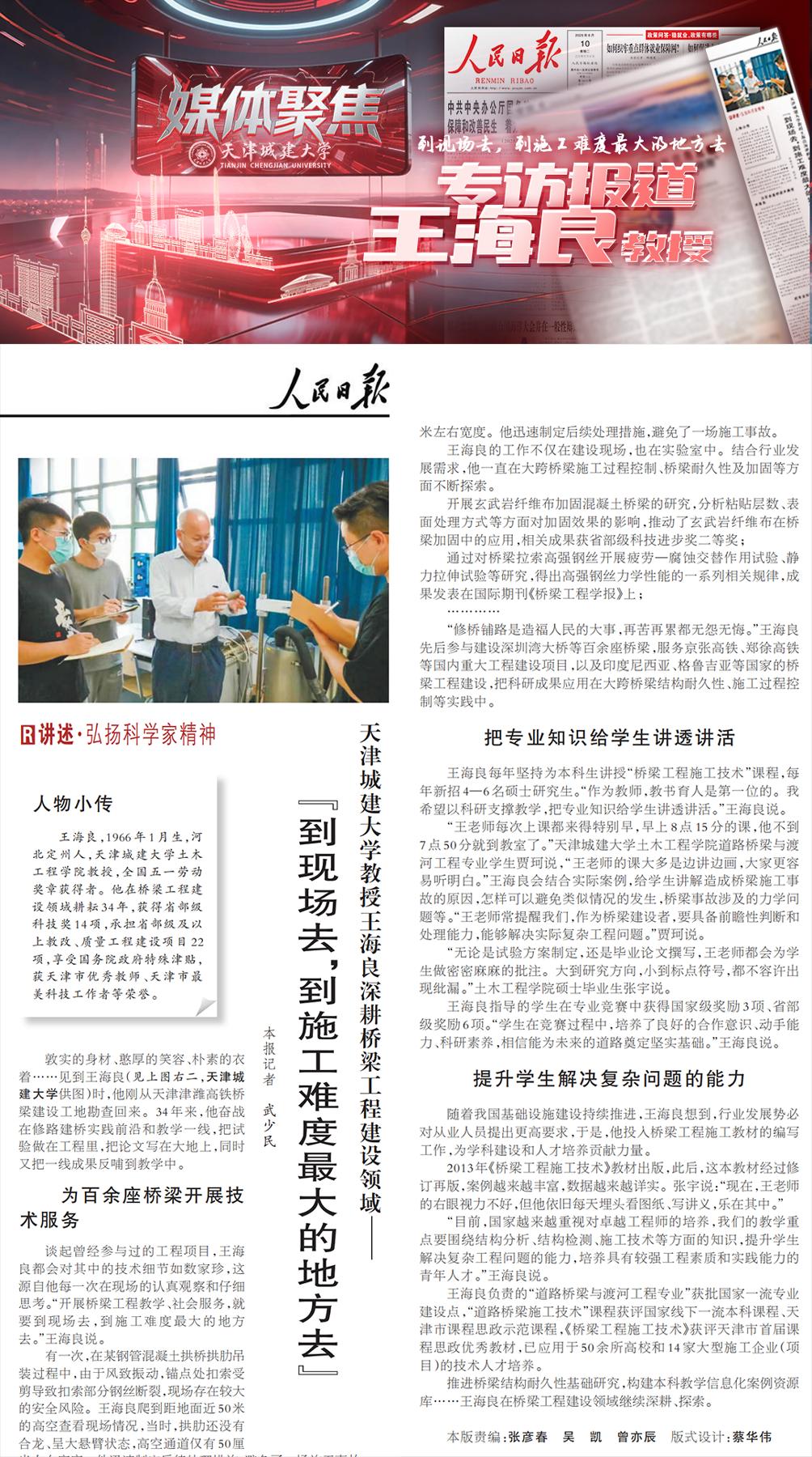 《人民日报》专题报道了beat365土木工程学院王海良教授的先进事迹。三十年来,王海良教授始终深耕桥梁工程一线,秉持“把试验做在工程里,把论文写在大地上”的理念,坚持深入施工现场攻克技术难题,以实际行动践行科学家精神,生动诠释了扎根实践、服务国家、教书育人的使命与担当。