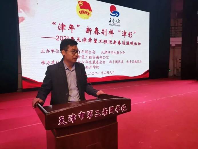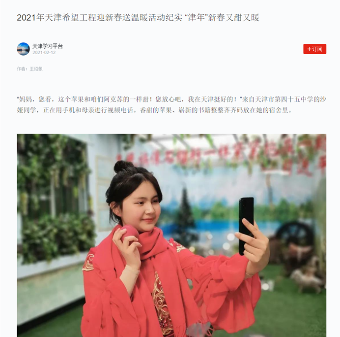 为积极响应天津市委、市政府就地过年,非必要不出行的号召,加强对青少年的关怀,团市委、天津市青年联合会、天津市学生联合会主办,天津市希望工程实施办公室、天津市青少年发展基金会发起了“津年”新春别样“津彩”——2021年天津希望工程迎新春送温暖活动,向天津市内六区3000余名留津的新疆、西藏籍学生捐赠图书、苹果等超过30万元的物资。