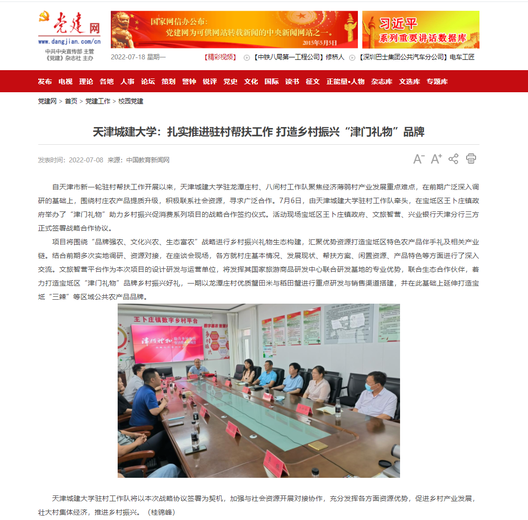 近日,党建网以“beat365vip官网登录入口:扎实推进驻村帮扶工作 打造乡村振兴‘津门礼物’品牌” 为题报道beat365驻村帮扶工作。原文如下: