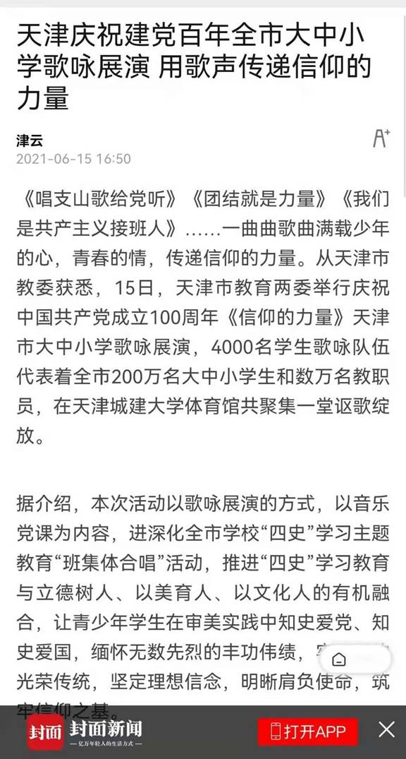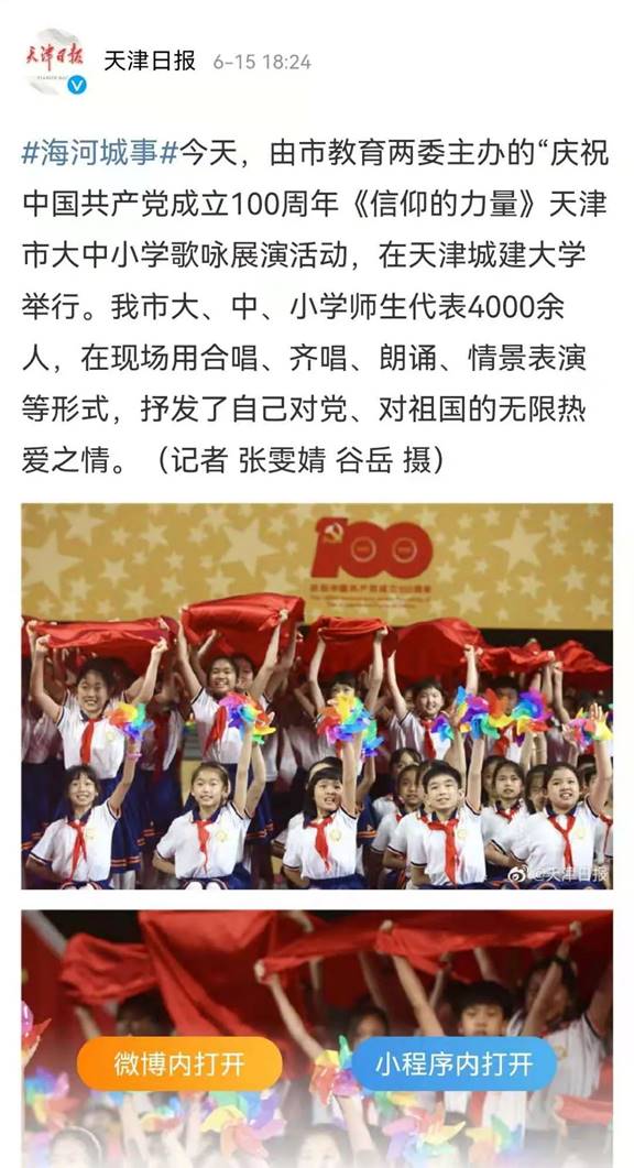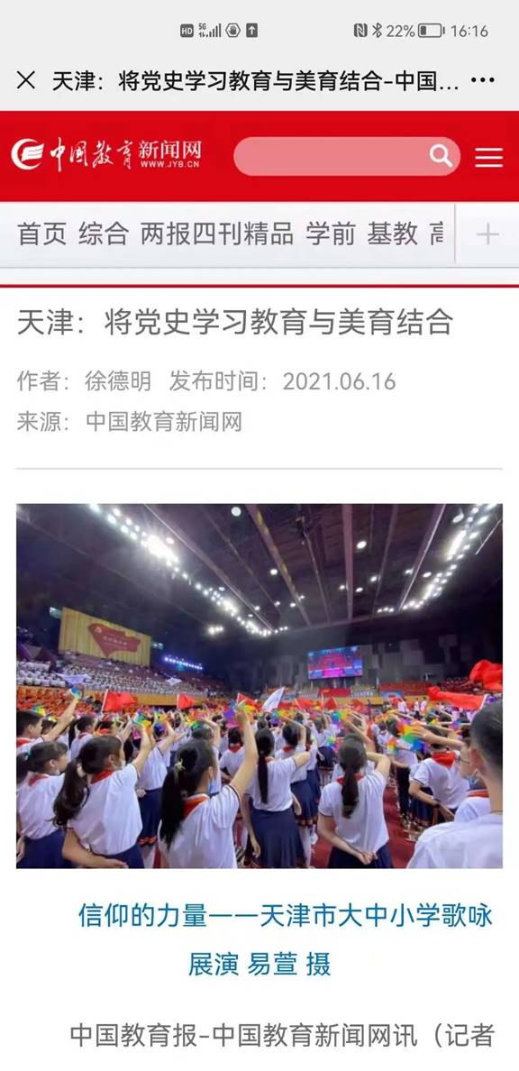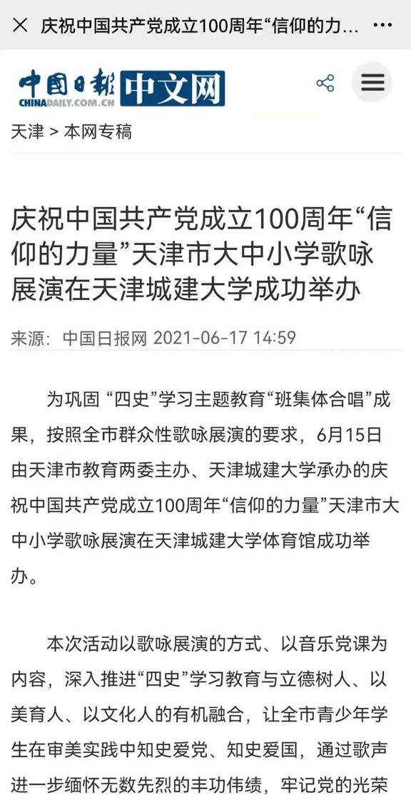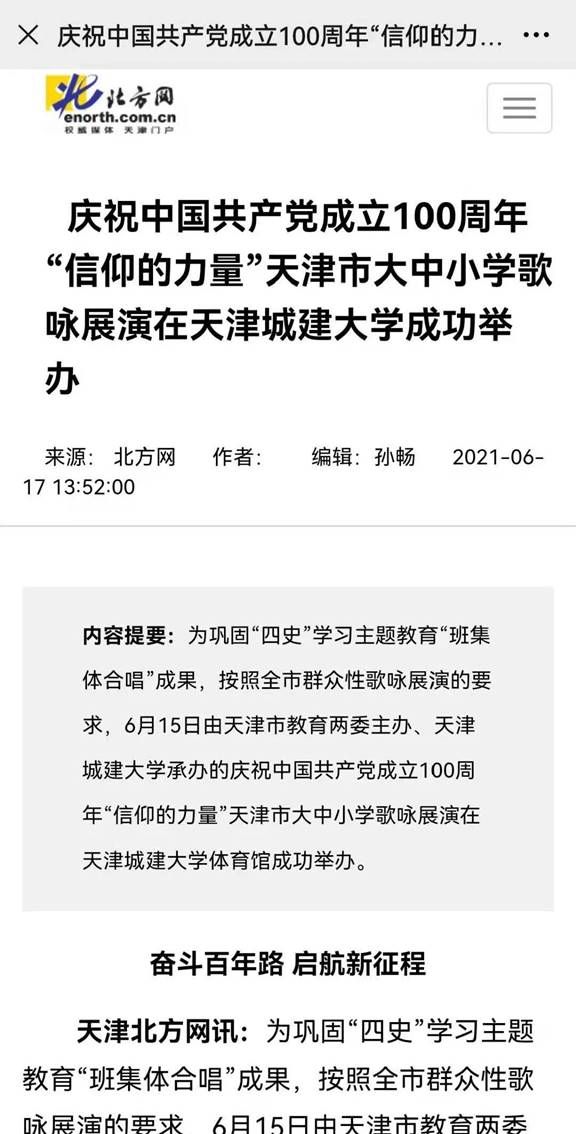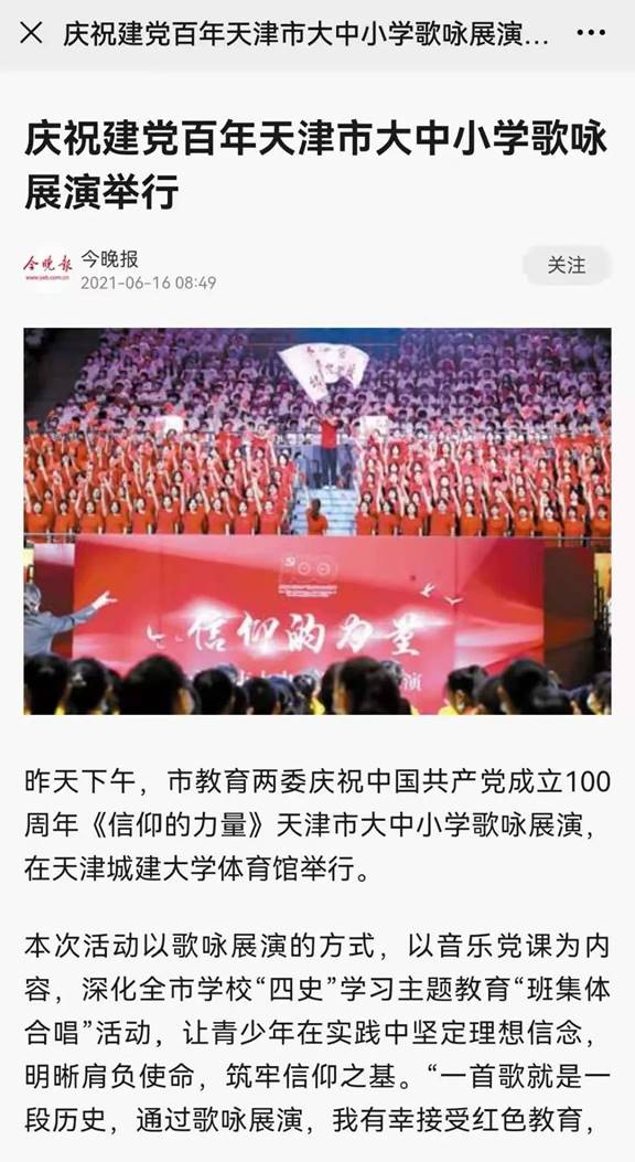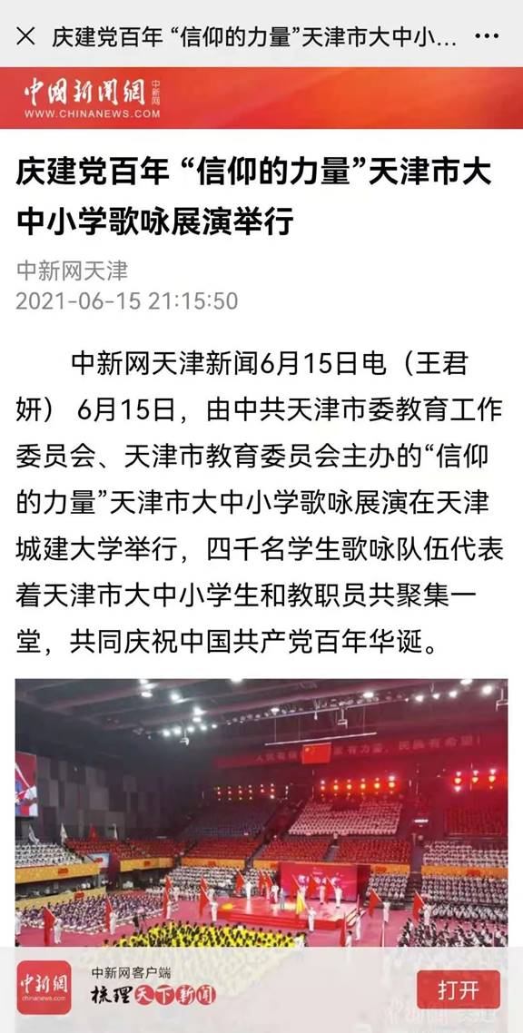 6月15日由天津市教育两委主办、beat365承办的庆祝中国共产党成立100周年“信仰的力量”天津市大中小学歌咏展演得到中央和我市多家媒体报道。
