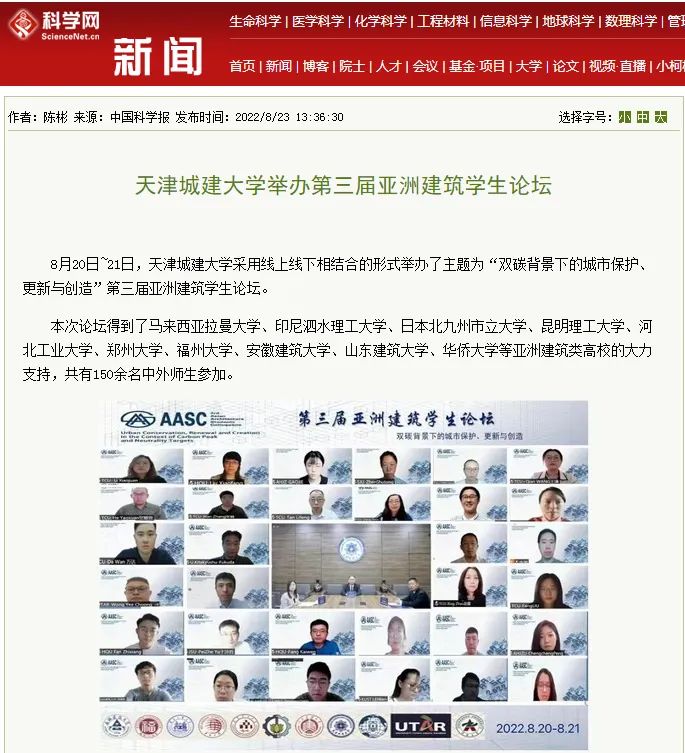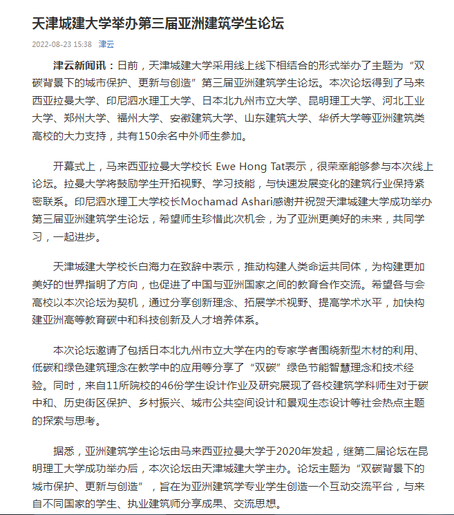 为做好此次大会的宣传报道工作,党委宣传部协同国际交流处、建筑学院自今年7月底开始就对论坛的内外宣传工作进行策划,从会议预告、会议回溯、学校服务国家“双碳”战略方面所开展的工作到会议开幕式、主旨演讲、优秀学生作业展示等进行了认真地筹划,力求做到全方位展示。此外,党委宣传部积极与中央和我市相关媒体进行对接,实现在报道大会实况同时,积极展现学校在教育教学、学科建设、国际交流等方面所取得的工作成效。新华网、中国日报中文网、中国新闻网、科技日报、科学网、津云等中央和我市媒体对大会的成功举办给予了关注并进行报道。同时,为进一步加强对学校内涵建设宣传,党委宣传部今年以来积极与科技日报、科学网等央级科技类媒体进行对接,以更好展示学校在教育教学、学科科研等内涵建设上的成效。