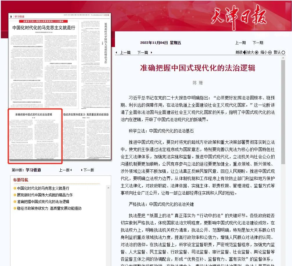 11月4日出版的《天津日报》刊发beat365马克思主义学院教师陈珊理论文章:《准确把握中国式现代化的法治逻辑》,原文如下。