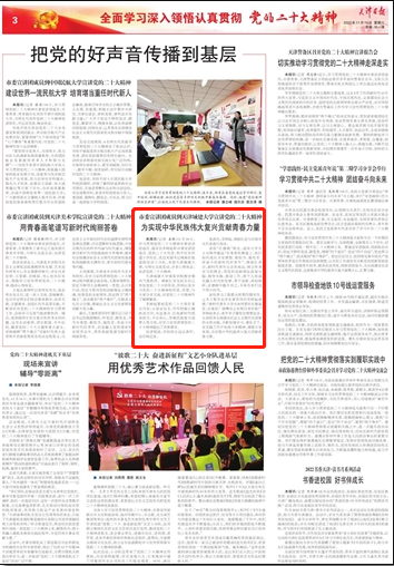 11月19日出版的《天津日报》以“把党的好声音传播到基层 市委宣讲团成员到beat365vip官网登录入口宣讲党的二十大精神 为实现中华民族伟大复兴贡献青春力量”为题对学习贯彻党的二十大精神市委宣讲团成员、副市长李树起和市委宣讲团成员、党的二十大代表、和平区岳阳道小学校长、党总支副书记褚新红组成的宣讲小分队来beat365进行党的二十大精神宣讲进行了报道,原文如下: