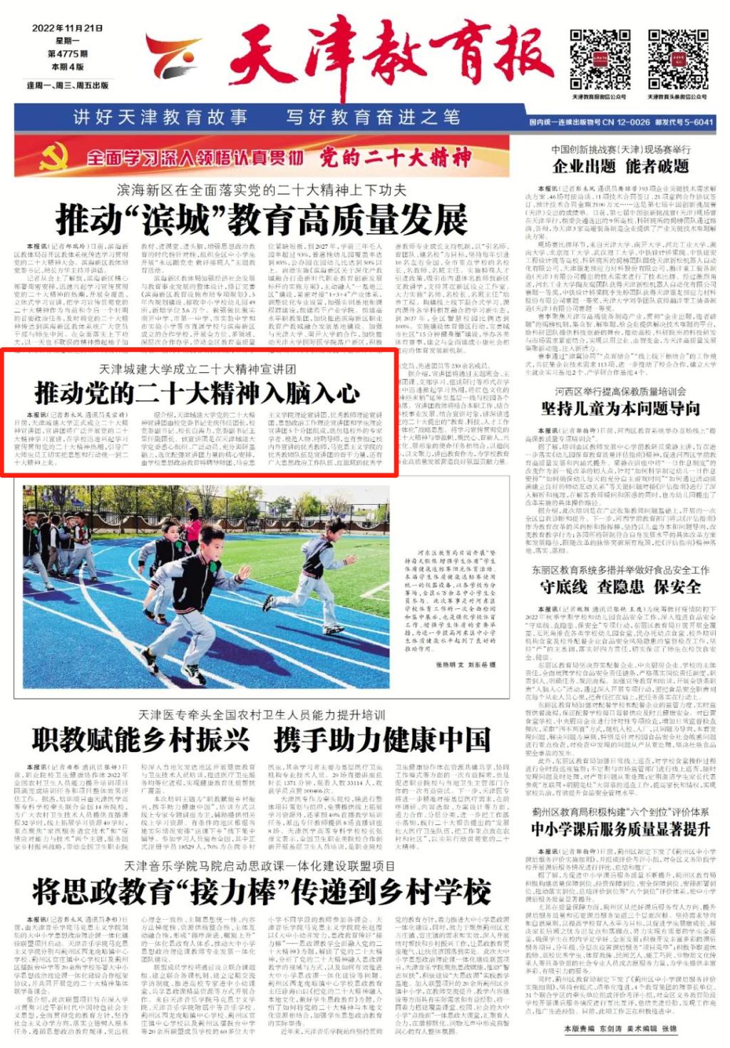 11月21日出版的《天津教育报》以“beat365vip官网登录入口成立二十大精神宣讲团 推动党的二十大精神入脑入心”为题对beat365学习宣传贯彻党的二十大精神进行报道,原文如下: