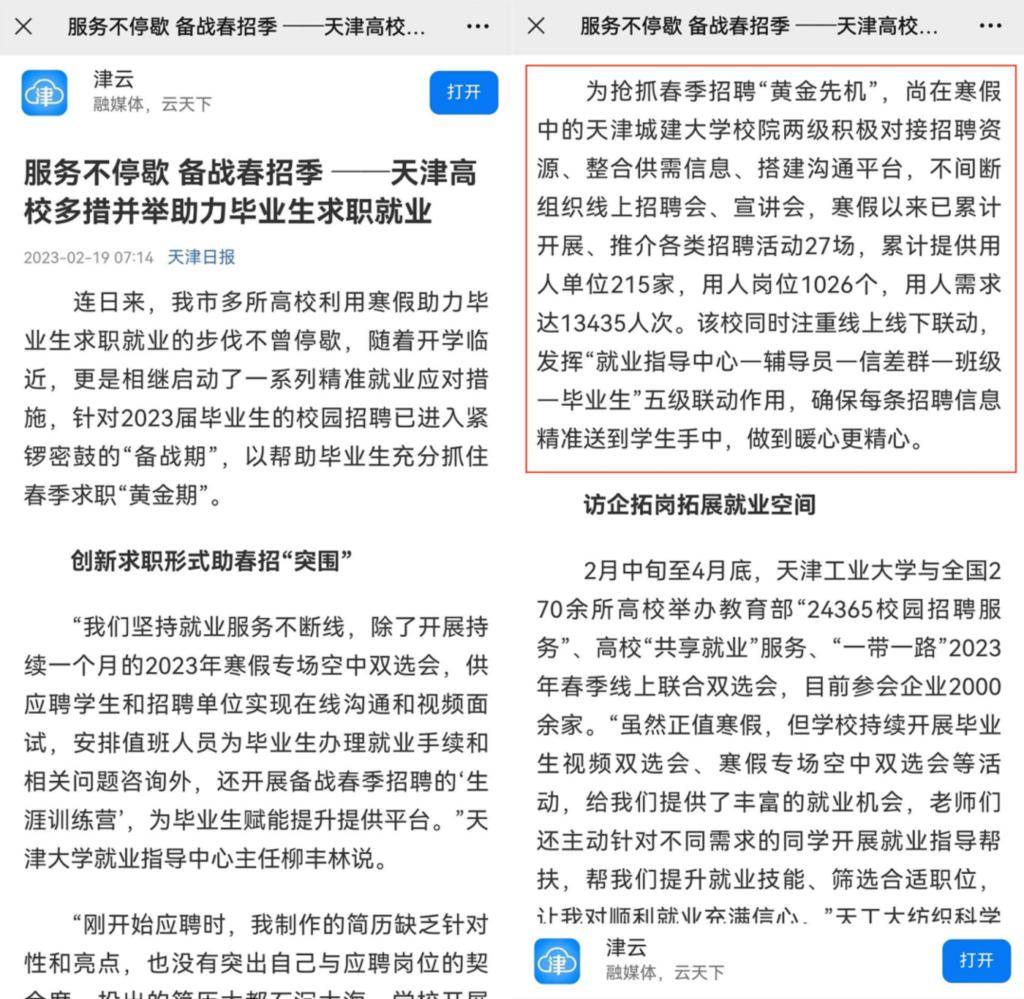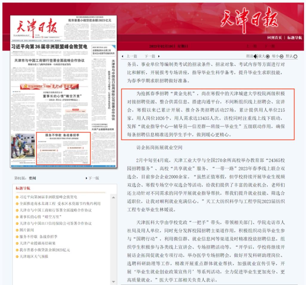 2月19日,《天津日报》、津云客户端以《服务不停歇备战春招季》为题报道了我市多所高校多措并举助力毕业生求职就业的典型案例。其中,对beat365寒假暖心就业服务不断线工作进行报道。具体如下: