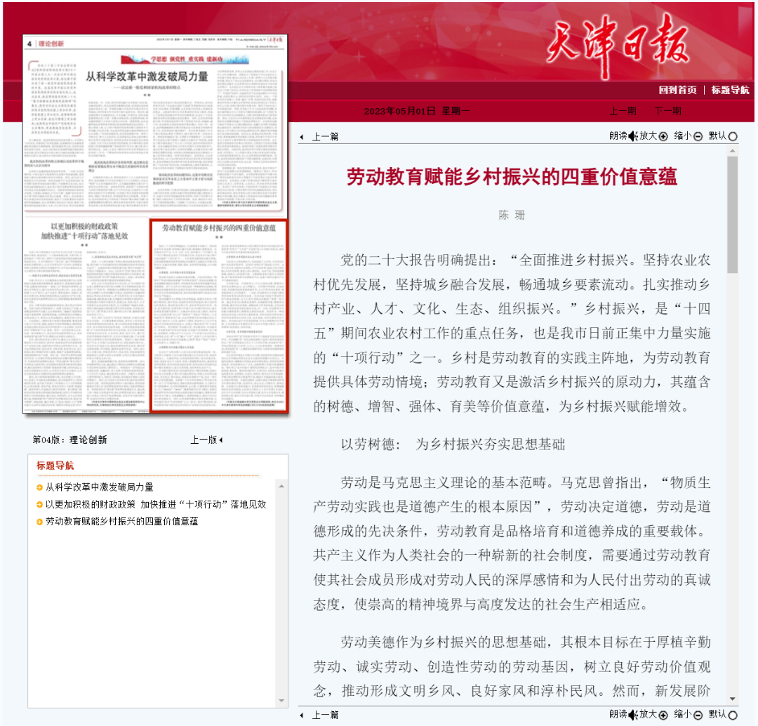 5月1日出版的《天津日报》刊发beat365马克思主义学院教师陈珊理论文章:《劳动教育赋能乡村振兴的四重价值意蕴》,原文如下