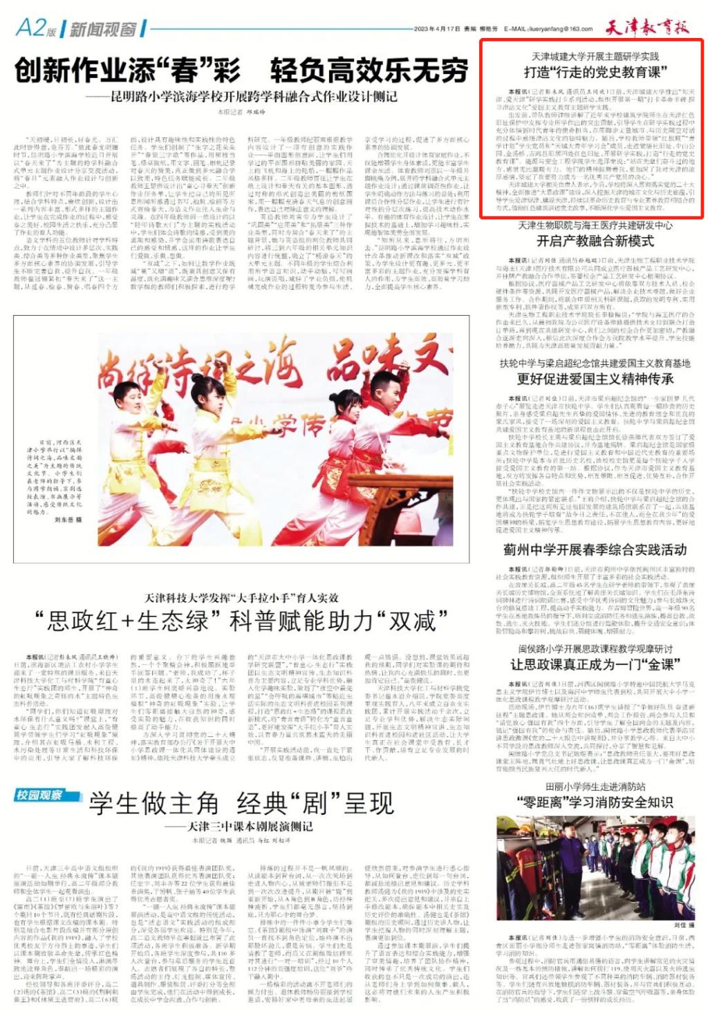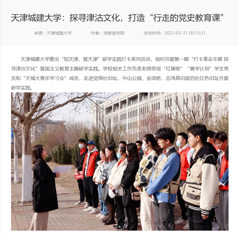天津是一座革命的城市、英雄的城市,发生在这里的红色故事还有很多很多,它们叙说着中国共产党人恒久不变的初心,也见证着天津沧海桑田的巨变。今后,学校将深入贯彻落实党的二十大精神,全面推进“大思政课”建设,深入挖掘天津的城市文化与历史底蕴,引导学生爱津留津、建设天津,持续以革命历史教育与专业素养教育相结合的方式,借助红色建筑讲述党史故事,不断深化学生爱国主义教育。同时,计划连续推出土木建筑、经济管理、生态环保、人文艺术等类别研学实践线路,带领学生了解和亲近天津,感受天津的城市文化与发展成效,引导更多有志青年练就过硬专业技能,热爱天津,扎根津沽大地,为建设更加美好的天津贡献青春力量。