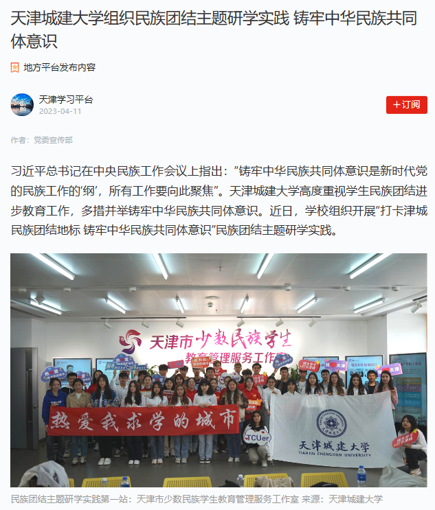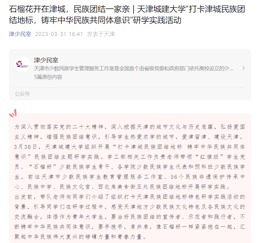 习近平总书记在中央民族工作会议上指出:“铸牢中华民族共同体意识是新时代党的民族工作的‘纲’,所有工作要向此聚焦”。beat365vip官网登录入口高度重视学生民族团结进步教育工作,多措并举铸牢中华民族共同体意识。3月30日,学校组织开展“打卡津城民族团结地标 铸牢中华民族共同体意识”民族团结主题研学实践,学校“石榴籽”少数民族工作室学生骨干、各学院少数民族学生代表、预科班少数民族学生和“红旗班”学生党员40余人参加活动。