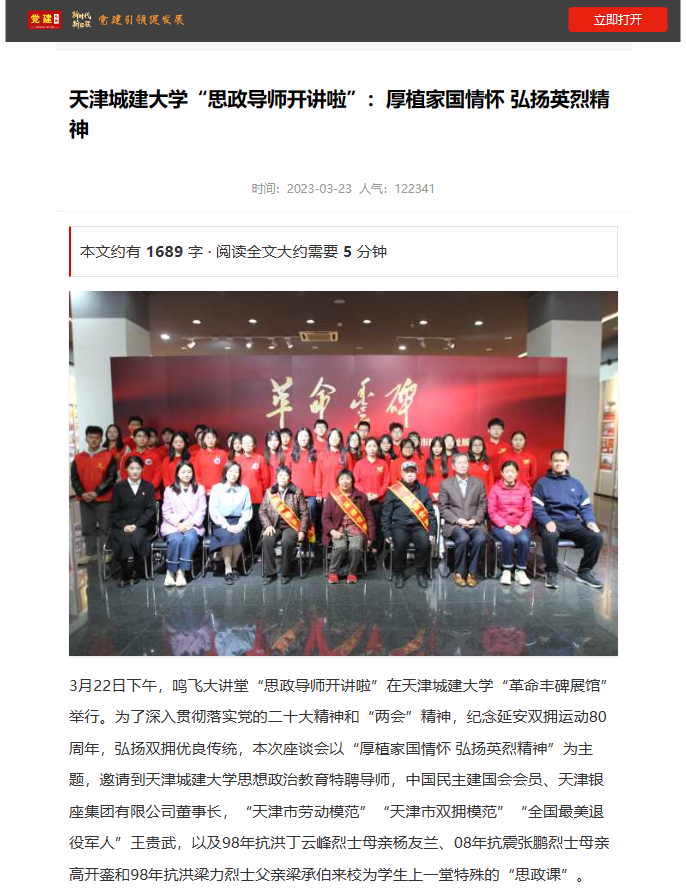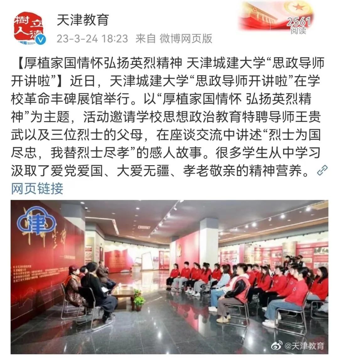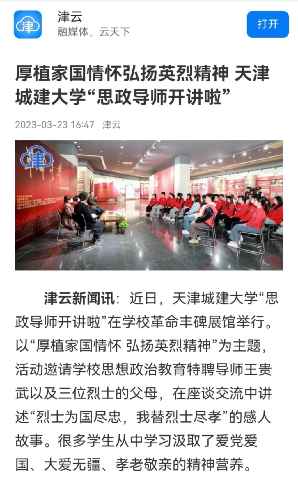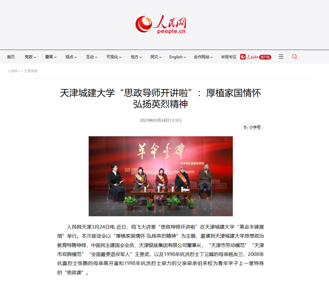 近日,鸣飞大讲堂“思政导师开讲啦”在学校“革命丰碑展馆”举行,3月24-26日,人民网、《天津日报》、津云客户端、天津教育、党建头条客户端等多家媒体对beat365大思政课“校厚植家国情怀 弘扬英烈精神”进行报道,现将部分媒体报道汇总如下: