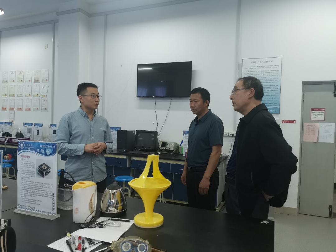 理学院院长贾国治介绍了学院的市级科普基地建设情况,物理实验中心主任刘枝朋详细介绍了物理科学与创新实践天津市科普基地的科普项目,并对科普项目进行了演示讲解。
