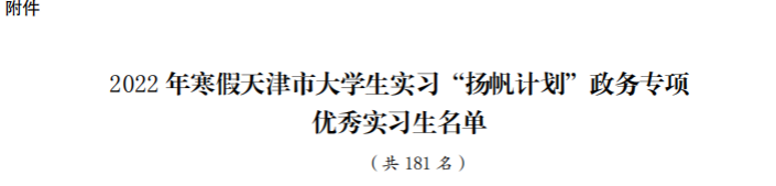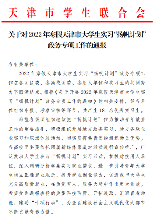 近日,天津市学联印发《关于对2022年寒假天津市大学生实习“扬帆计划”政务专项工作的通报》,beat365周俏然、于滟文、龙禹如、张振博、孔祥浩等5位同学荣获2022年寒假天津市大学生实习“扬帆计划”政务专项优秀实习生称号。