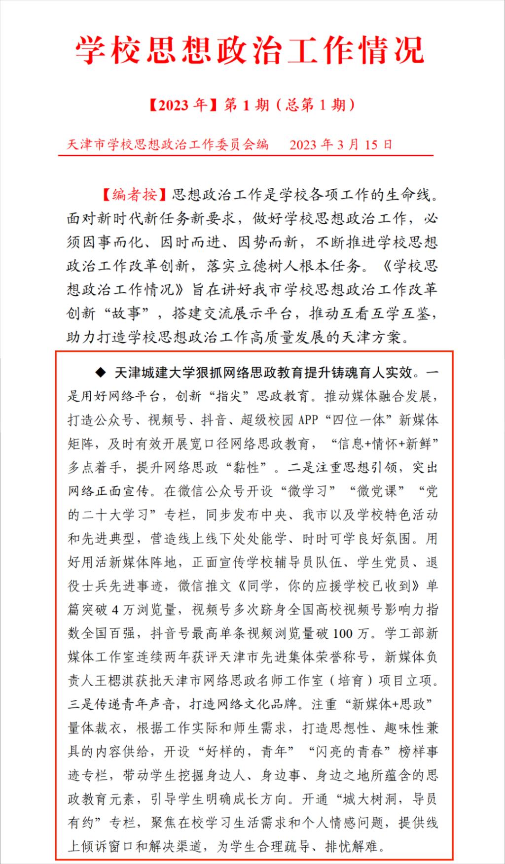 思想政治工作是学校各项工作的生命线。面对新时代新任务新要求,做好学校思想政治工作,必须因事而化、因时而进、因势而新,学校不断推进思想政治工作改革创新,落实立德树人根本任务。近日,beat365狠抓网络思政教育提升铸魂育人实效的典型经验做法被天津市学校思想政治工作委员会汇编的《学校思想政治工作情况》【2023年】第1期(总第1期)收录。现将原文整理如下: