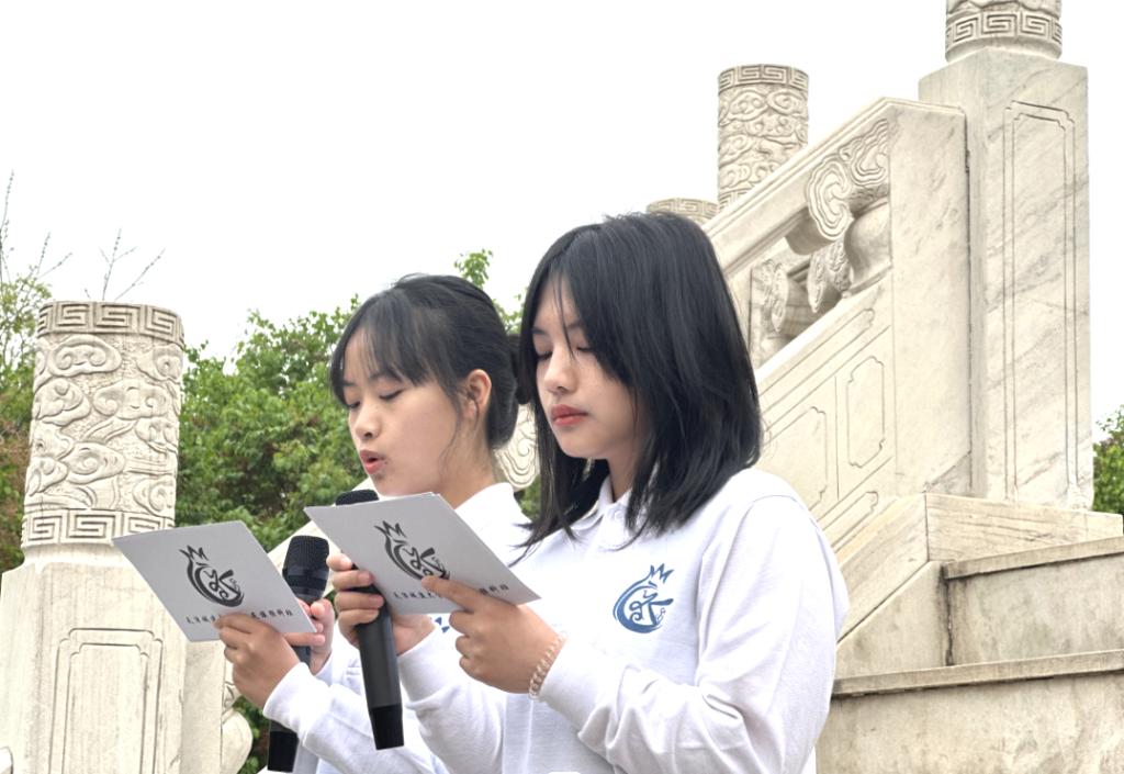 预科班少数民族学生代表覃缤红、何亚娟诵读缅怀诗歌《他们为我而死》,以红色经典缅怀革命先烈,传承先烈遗志。