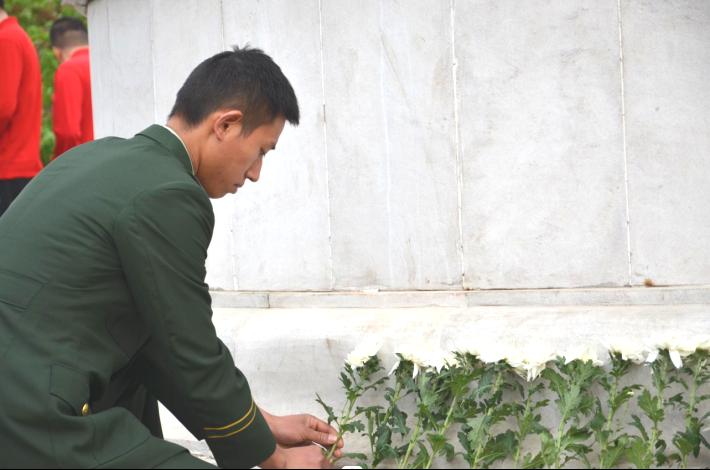 松柏凝翠,素花含情。纪念碑前,全体师生庄严肃立,向为国捐躯的革命先烈低头默哀,深深鞠躬,敬献菊花,以此寄托哀思,缅怀他们的丰功伟绩和崇高精神,表达对革命烈士的深切悼念和崇高敬意。
